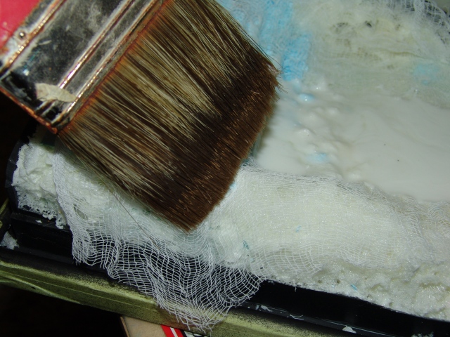 После накрываем изделие марлей,промазывая,приклеиваем к основанию.Это даст лучшую сцепку гипса с пеной,ну и допалнительная жесткость не помешает!