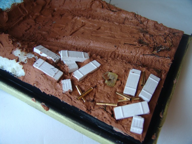 Немного подождав снимаем пленку иначинаем вносить в пейзаж детали.Ящички готовы, туда их.Немного веточек каких то гильзочек и конечно потоптаться ножками,оставляя следы