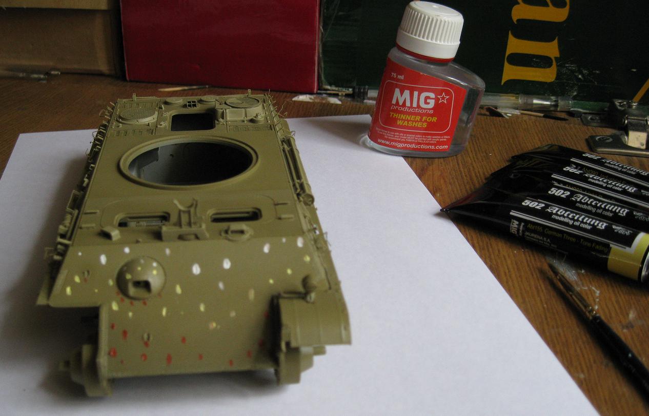 Никита ДОБРЫНИЧ, копоть от снарядов появляется весьма незначительно при попадании в броню кумулятивных и осколочно-фугасных снарядов, поэтому следует несколько уменьшить имитацию пятна копоти. Ну и лично моё мнение: коль уж драгоновскую Пантеру собирать, то не помешал хотя бы интерьер башни, а то наряду с прекрасно проработанным внешним видом, точностью соответствия чертежам и проработанной по максимальной возможности литья для этого масштаба мелочёвкой ещё и добавляется скучная пустота башни, не говоря уже о корпусе. Наверняка инженеры-проектировщики фирмы Dragon, изготавливая столь подробно торсионно-балансирую подвеску Пантеры и курсовой пулемёт, предусматривали установку интерьера моделистами. Я бы добавил ещё интерьер к Пантере, разумеется, не склеивая потом весь корпус и башню, чтобы потом было видно только 20-25% интерьера, а рационально продумав места разъёма корпуса с последующим выбором максимальной живучести и оптимальной конструкции скрепляющих узлов. Не смею вас упрекать или обидеть, это моё личное мнение.