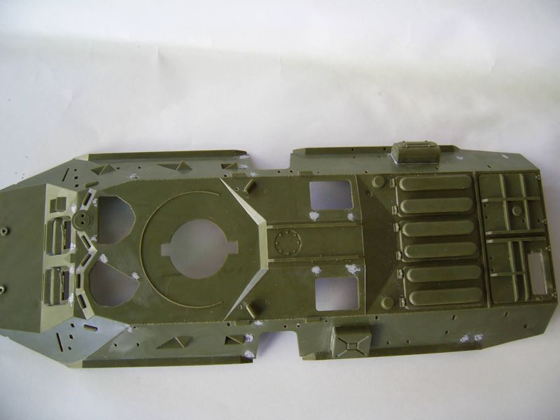 Корпус, похоже, таки короче в передней части. Должен быть сварной шов перед пулеотбойником. Его нет. И петли люков, по большому счету, будут упираться в башню. Верхние крышки люков все-таки пришлось сточить. Получается уже не копийно, но деваться некуда. Сами крышки люков стали меньше. Пришлось заделать отверстия под верхние и передние крышки люков. Передние крышки будут чуть опушены вниз, а то петли тоже не поместятся. Перископы на ботрах срезал. Они должны быть немного ниже. Сами обзерочки не выбрасваем: их потом наклеем и на них потом будем лепить жесть. Верхние перископы на крыше десантного отделения тоже будем выбирать изнутри.