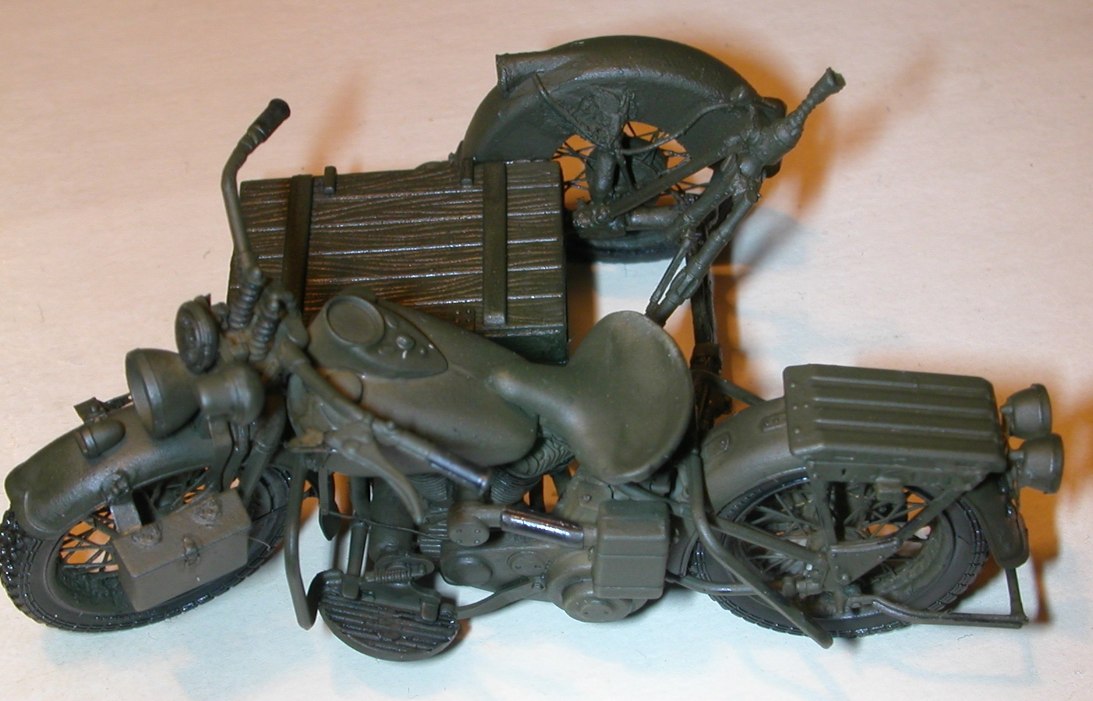 Наконец вышел на финишную прямую по...(не так давно размещал фото харли с коляской из сопровождения). Делаю расчет минометчиков на 2-х харлеях с колясками (на одной из которых будет располагаться 82-мм батальонный миномет обр. 1937 г.от "Сталинграда"). По штату и фотографиям как смог разобраться, один миномет обслуживали 4 чел. с сопровождением из 2-х мотоциклов на одном из которых как раз и располагался сабж. По коляске с минометом сделал заготовку, шасси от коляски Р-12(Звезда) с установленным на нем креплением для миномета и уложенным поверх рамы ящиком для 76мм снарядов от наших родных пушкарей - эт моя личная фантазия по украшению экстерьера, в ящике может быть размещен, как ЗИП, так и 4 мины(взят из набора бронебойщиков от миниарта, т.к. расчет миномета будет конверсирован из них). Уважаемые комрады, вопрос в целом прост! В интернете нашел всего 3 толковых фотографии по данному вопросу, о коляске с минометом… Хочется услышать предложения, советы по данному вопросу! Возможные способы крепления миномета, расположение зарядных ящиков и их крепления (предполагаю что часть из них перевозилась на 2-ом мотоцикле расчета). Тему взял неизбитую, ну уж очень хочется – привлекали меня всегда харли в советском колоре.