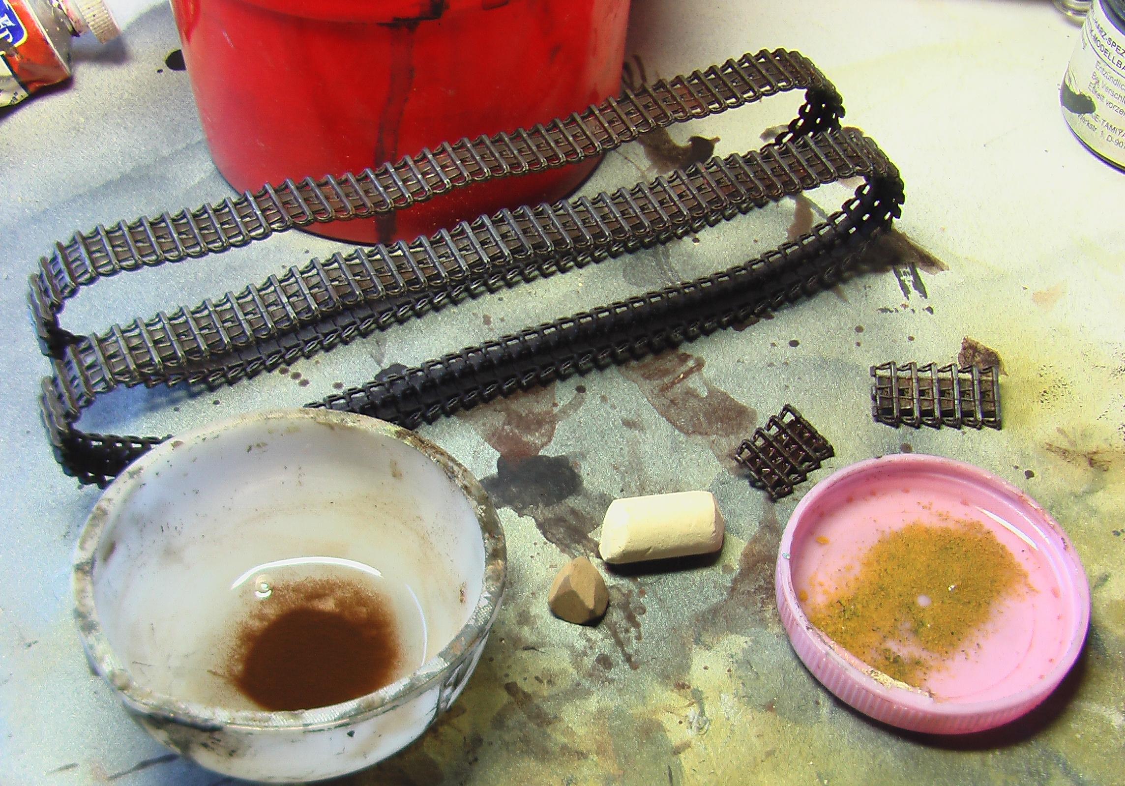 На смывку по гусеницам не нашлось нужного масла,потому пойдет в дело темпера "сажа газовая" и "сиена жженая".С начала прошелся черным,а потом смесью сиены и чуть черного.