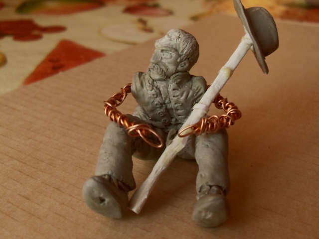 По поводу головы. Вывел гулять собаку и увидел потрясающий типаж. Мужик-полуалкаш, при сотворении которого мать-природа не удержала масштабы носа и всё остальное лицо подгоняла уже под него.Здоровый шнобель и непропорционально большая голова. В силу своих возможностей скопировал эту голову для Джонни.Ружьё, которое видно на фото-это пробный образец.Более удачный образец снял со стола пёс и ...и всё. Сделал подставку, на которой примостится Джонни.