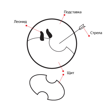 На схеме показаны следы (ноги) Леонида- они стоят на щите воина Ксеркса - щит обточен по краю виньетки.