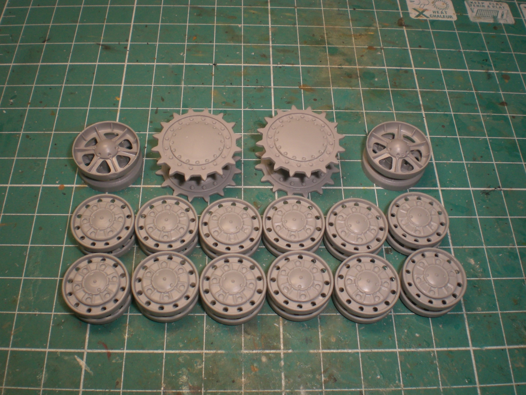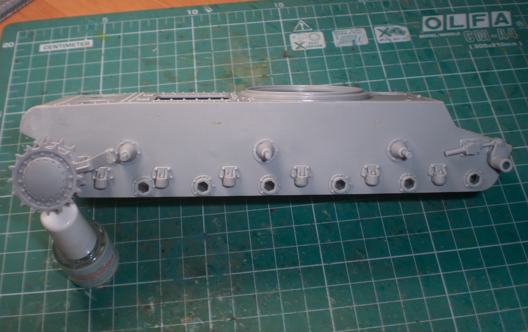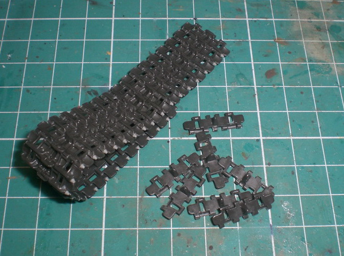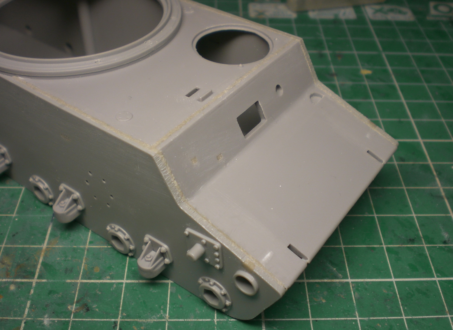 Гужоны я уже сделал, из двухкомпонентной шпатлевки, так же переделал стык кормового бронелиста и днища и установил на место грязеочистители (с ними пришлось много повозится из-за сильного смещения половин пресформ, поэтому (местами) с одной стороны деталь пришлось стачивать почти на половину, а с другой наращивать листовым пластиком) и ведущие звездочки.