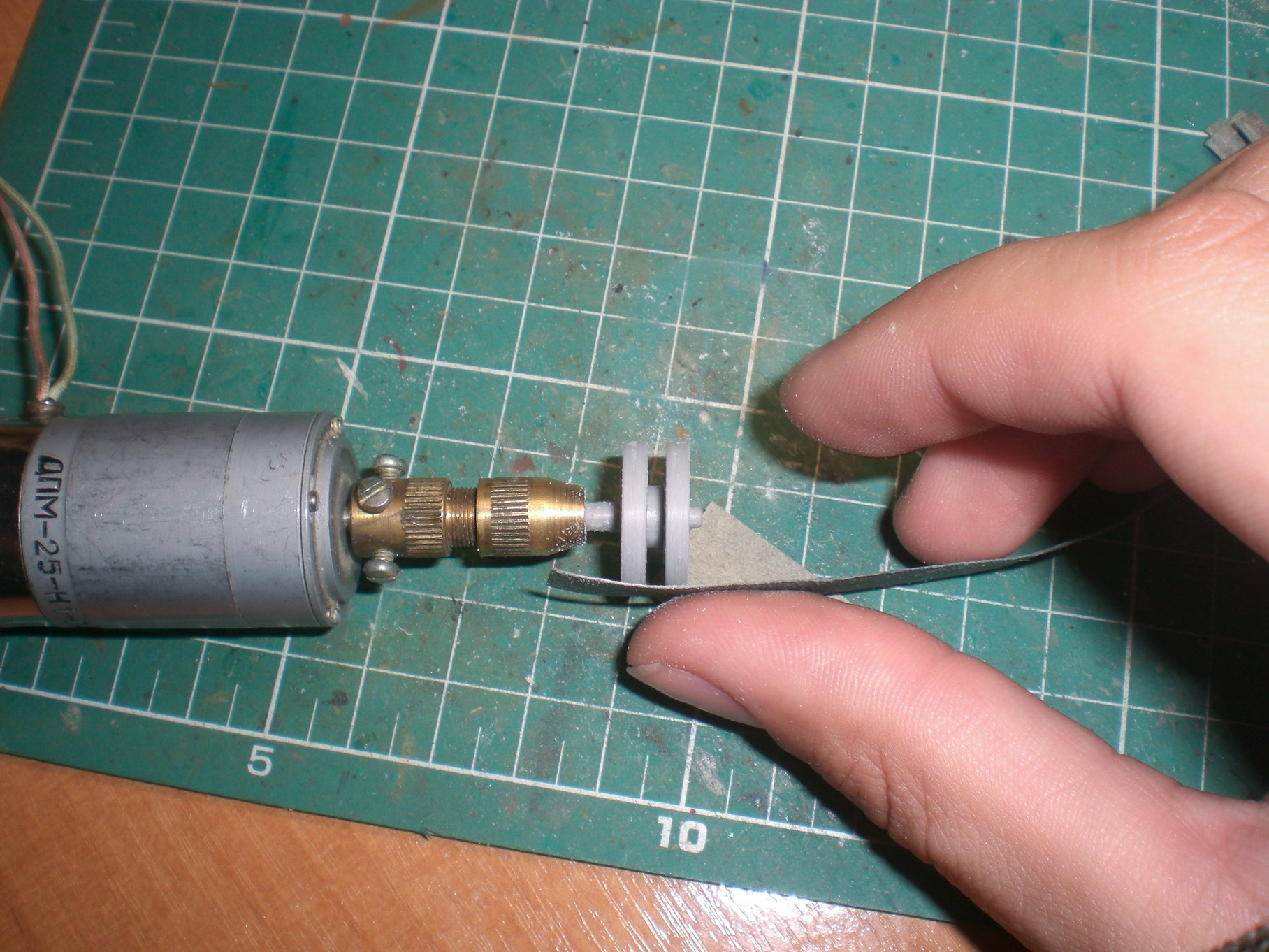 Продолжу, чтобы немного отдохнуть от корпуса взялся за катки, для удаления с катков стыка пресформ сделал небольшое приспособление из минидрели и пластикового ствола из набора.