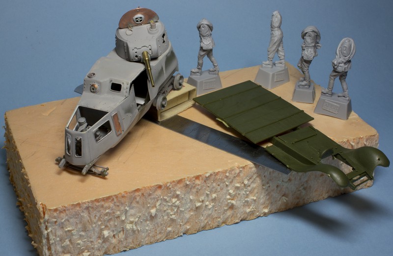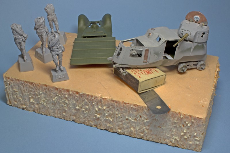 Скоро придется задуматься о поверхности, на которой будет стоять бронеавтомобиль и конфигурации ходовой. Поэтому я начал компоновать поставку. Тут я довольно жестко ограничен ее размерами. Плюс , хочется поместить не только БА, но и фрагмент грузовика и фигурки. Грузовик, скорее всего, пойдет именно фрагментом - будет поперечно отрезан по грани поставки, Буду жертвовать кабиной, так как кузов с четверкой Максимов должен остаться на диораме.