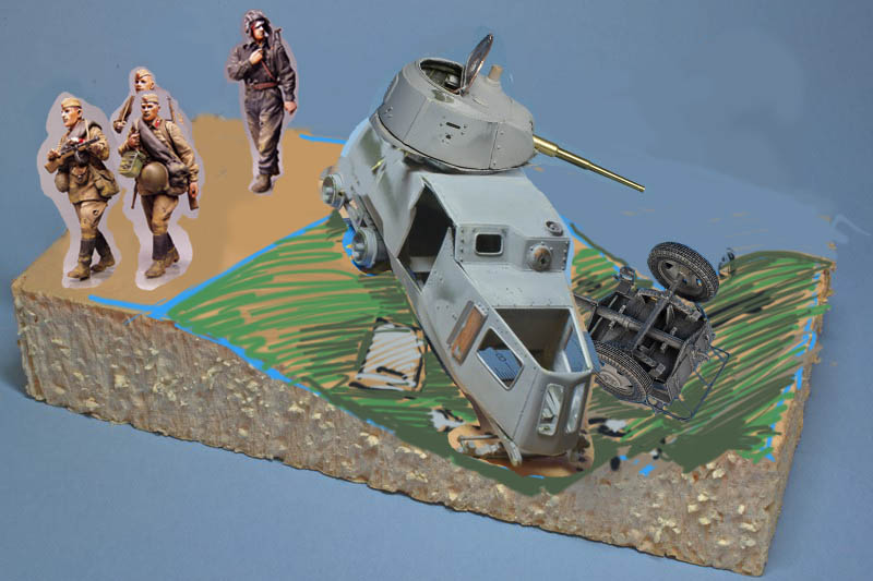 Что касается композиции... Последний вариант, на мой взгляд, - самый неудачный. Все разваливается в разные стороны. Основная ошибка, на мой взгляд, - это два объекта техники, практически равные по массе. Если считать, что БА - ОСНОВНОЙ персонаж диорамы, то грузовик сильно тянет на себя одеяло. Я бы его убрал. Если хочется добится эффекта большого колличества битой техники, то можно добавить что-нибудь размером поменьше. Например артиллерийский передок, покореженный мотоцикл, фрагмент поврежденной подводы и т.д. Фигурки я бы разделил на две группы: первая - это уходящие за кадр бойцы(не улыбающиеся, с не поднятыми вверх головами - исправлять не стал); вторая - слегка отставший танкист, которому повернуть голову в сторону БАшки. Тогда фигурки сюжетно свяжутся с техникой. Ну и на основании можно сделать обочину в виде выемки. Ниже примерный эскиз, как мне видится этот сюжет на основании такой формы. Творческих успехов!