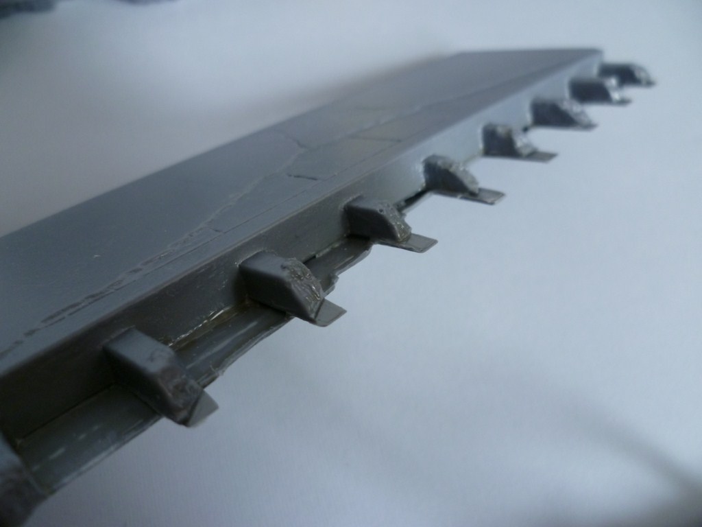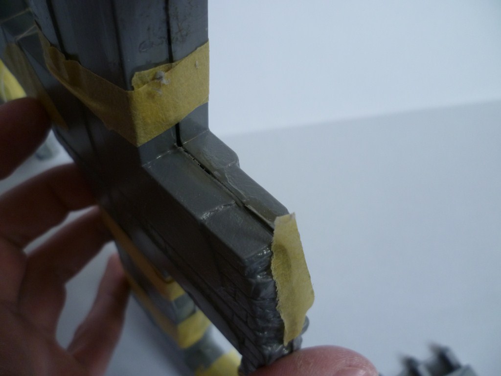 Вот мой способ (может пригодится): склеиваете здание обычным модельным клеем, оставляете сохнуть на 24 часа. Когда клей более-менее схватился, места швов зачищяете, а затем прорабатываете шпаклёвкой, и оставляее на сутки. Потом срезаете излишки шпаклёвки модельным ножом, и обрабатываете надфелем.