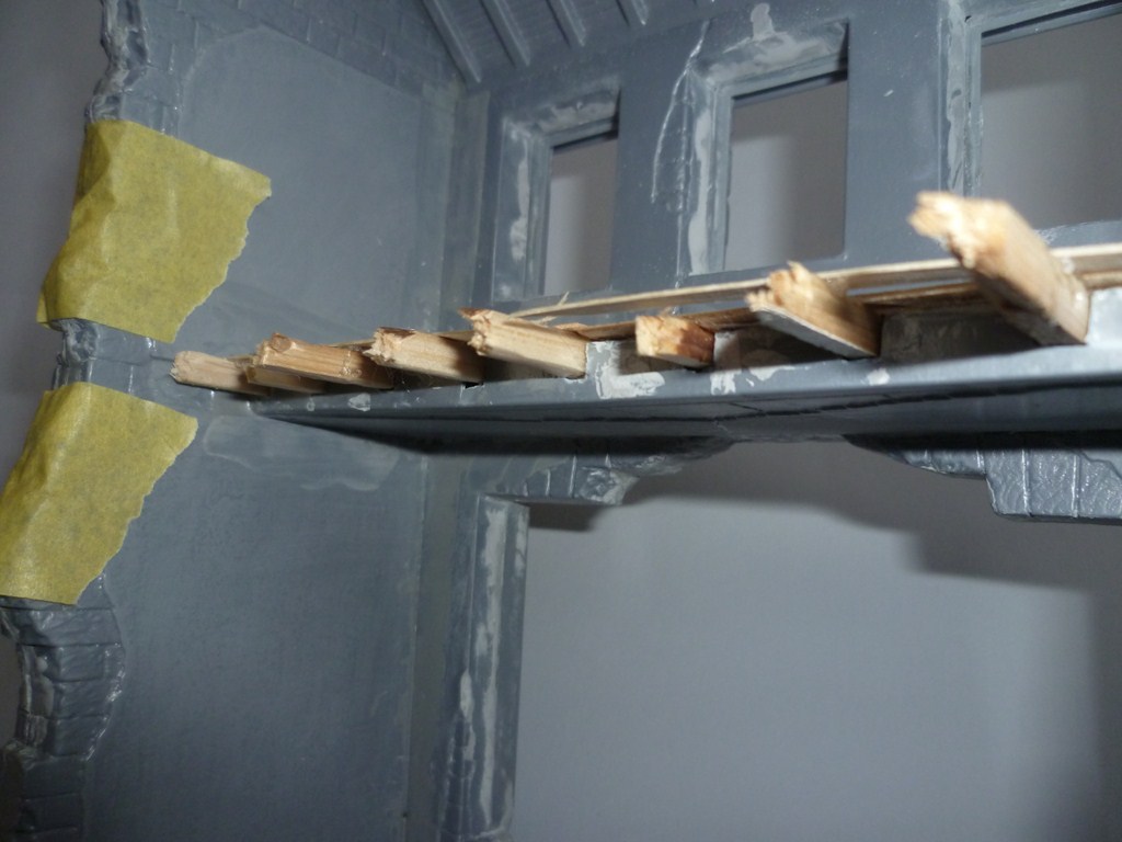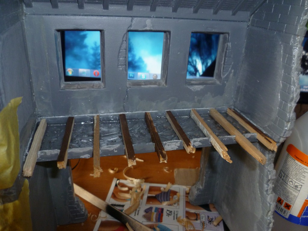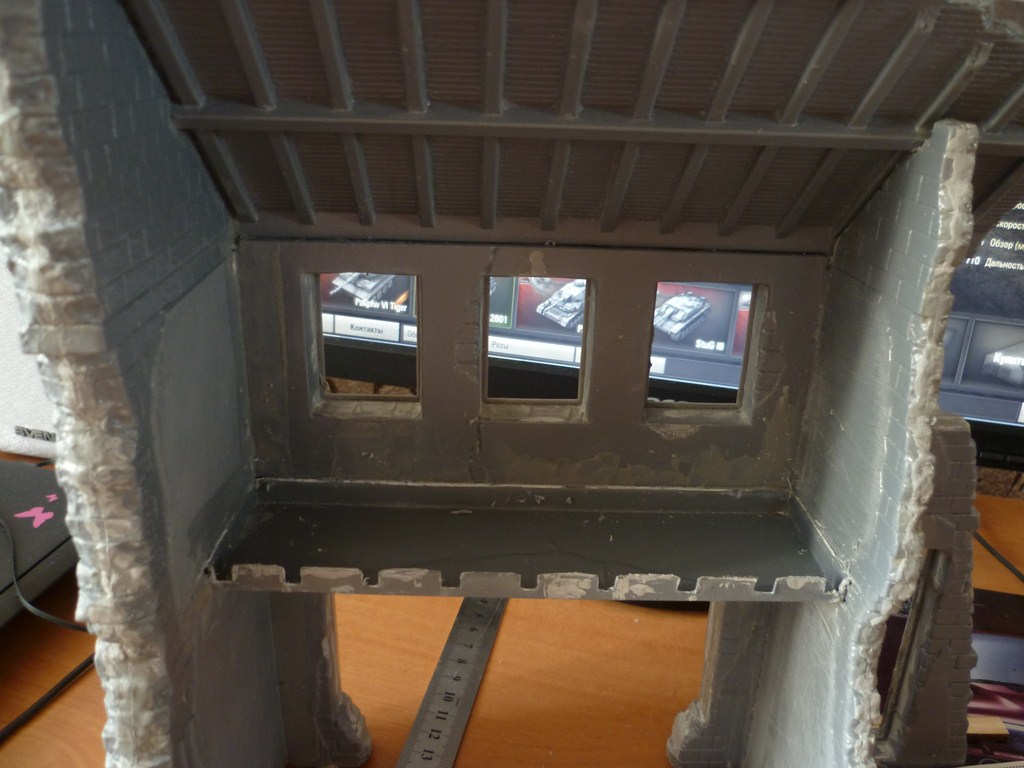 вот наконец склеил остов здания и в который раз прошпаклевал щели,также паралельно занялся мелочевкой,при изготовлении внутреннего убранства(вернее того что от него осталось)