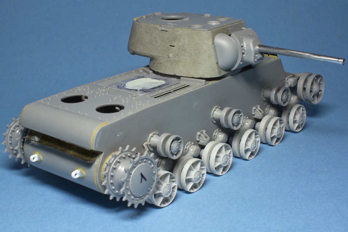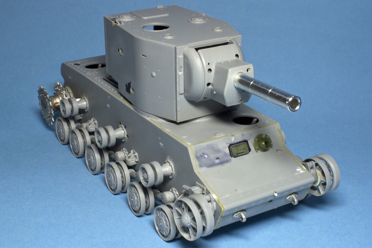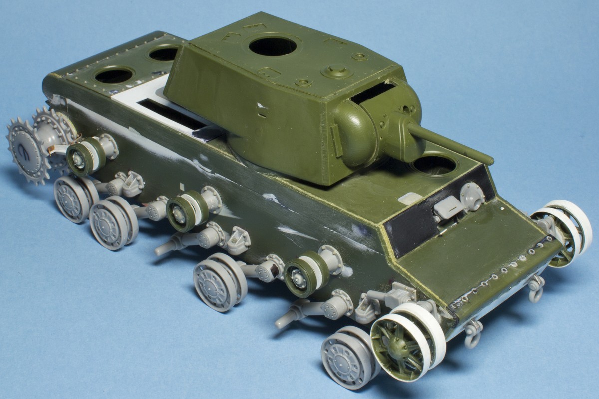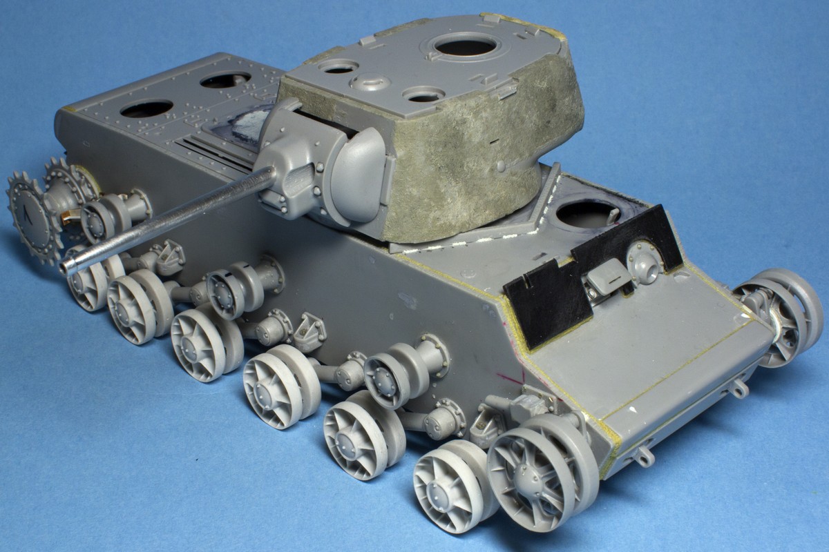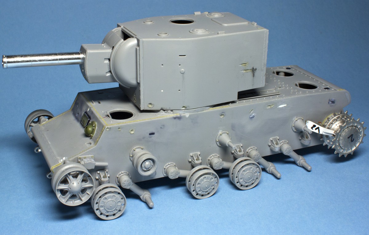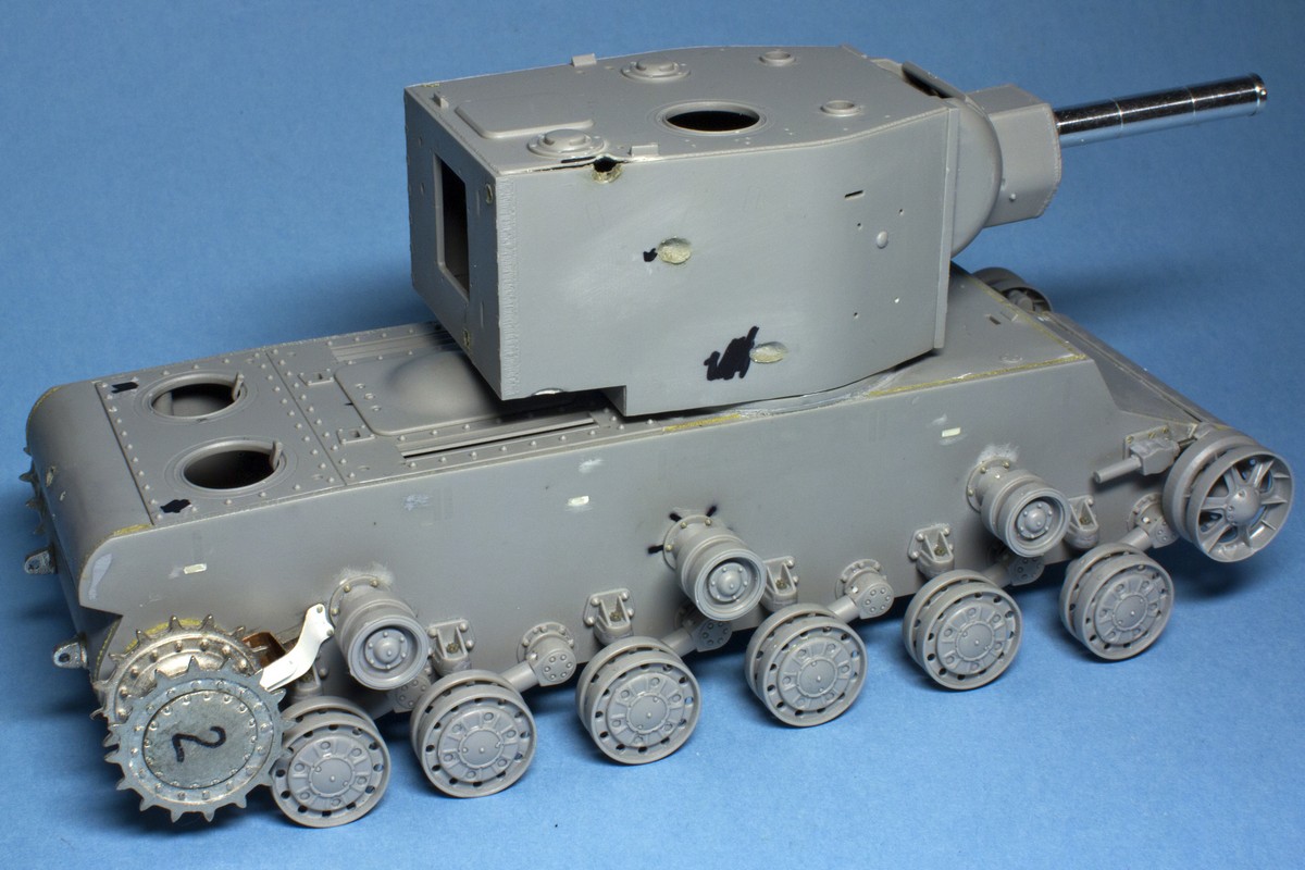 КВ-2 Корпус также практически завершен. Провозился с разрушенными катками -долго не мог понять, что там сломалось (не уверен, что и сейчас понимаю)