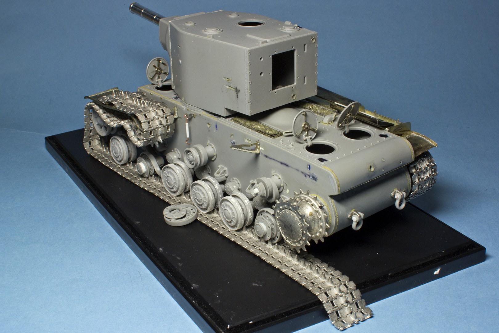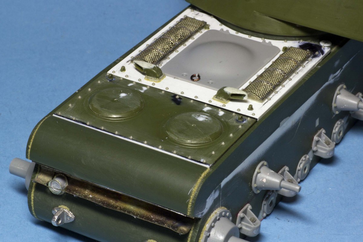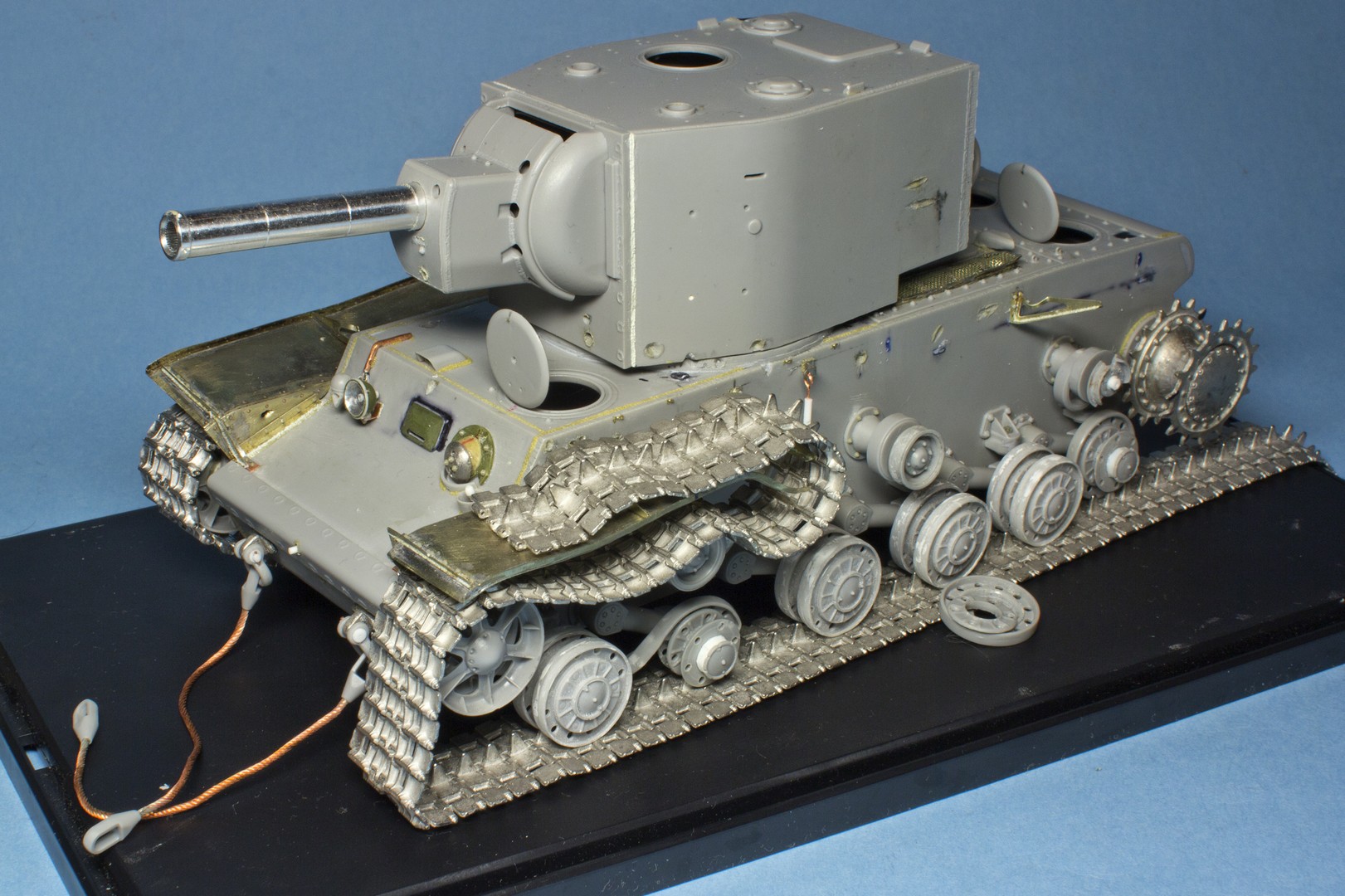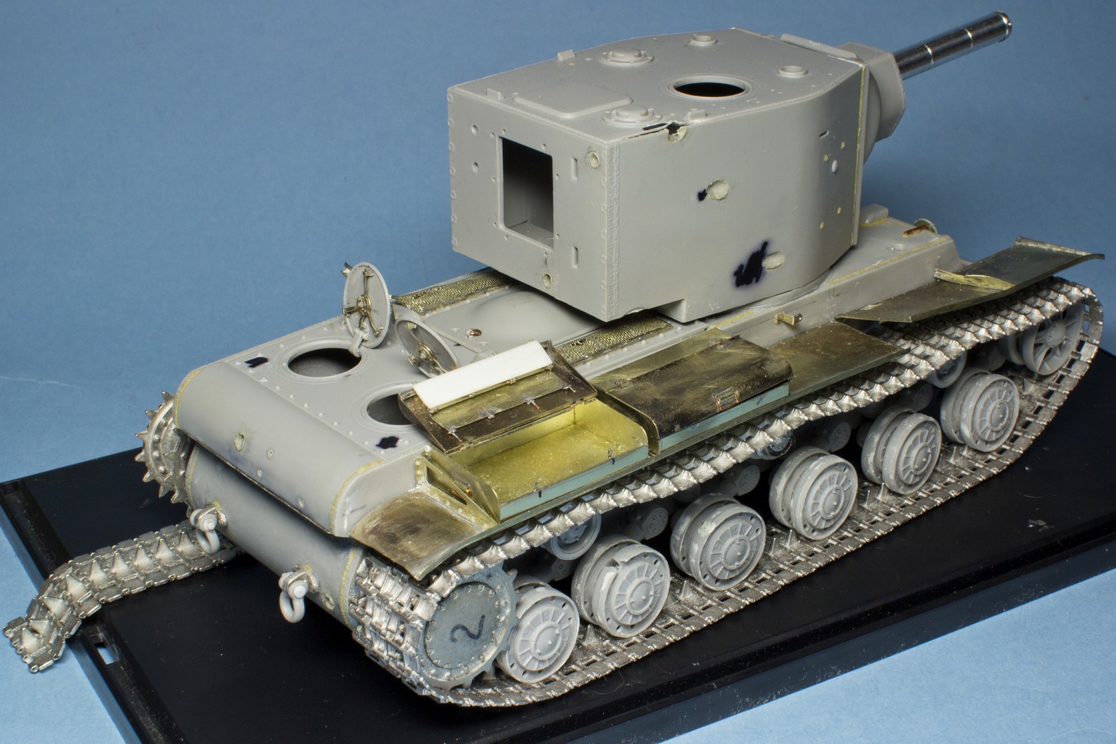 КВ-2 Корпус также практически завершен. Провозился с разрушенными катками -долго не мог понять, что там сломалось (не уверен, что и сейчас понимаю)