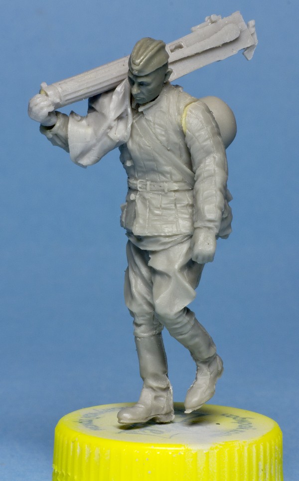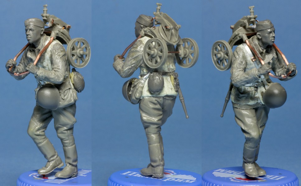 Решил попробовать свои силы в конверсии фигурок. Жертвой стал боец от Танка, который изначально тащил пулемет за собой. Я решил одеть его в телогрейку и взвалить станок от пулемета на спину.
