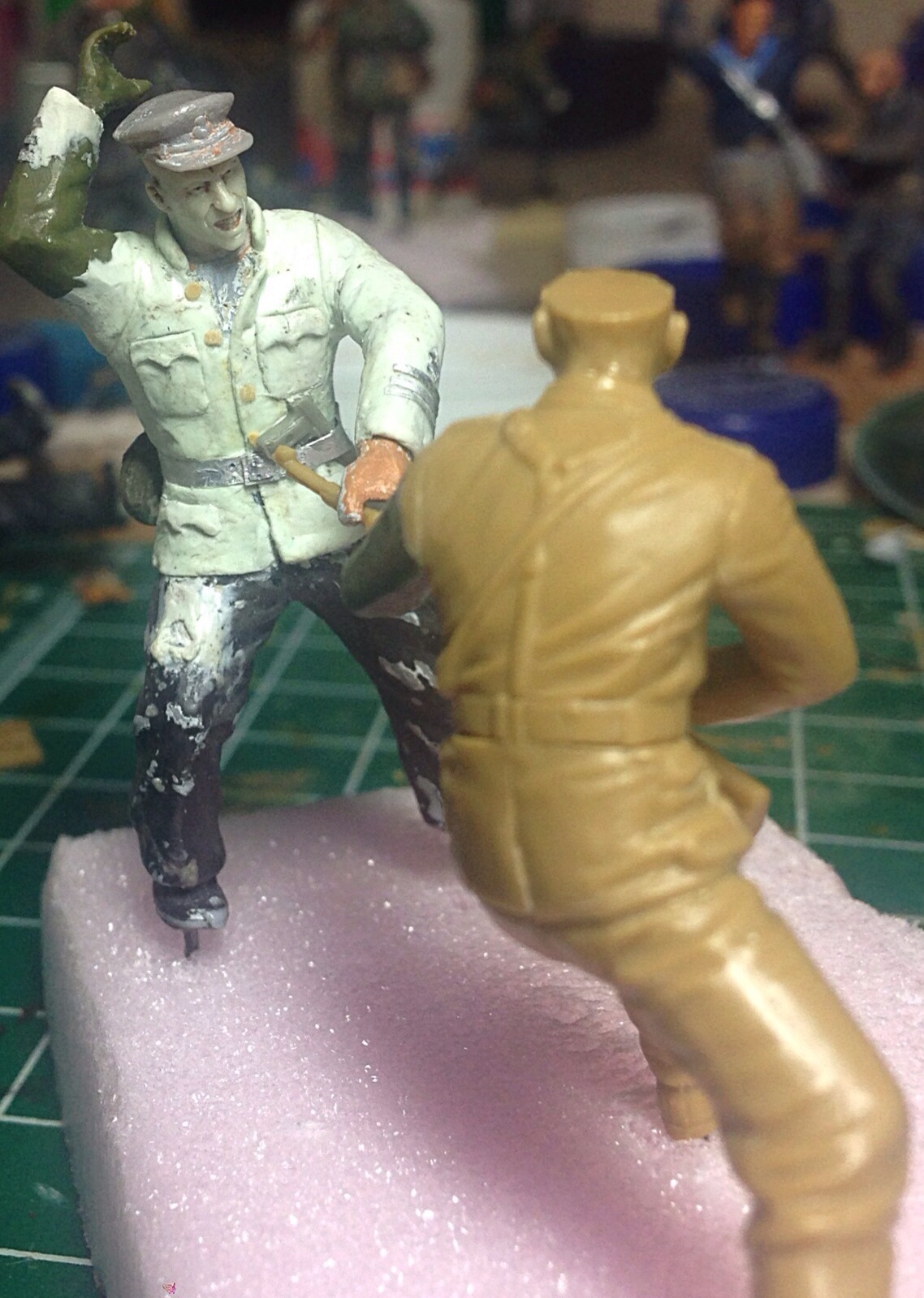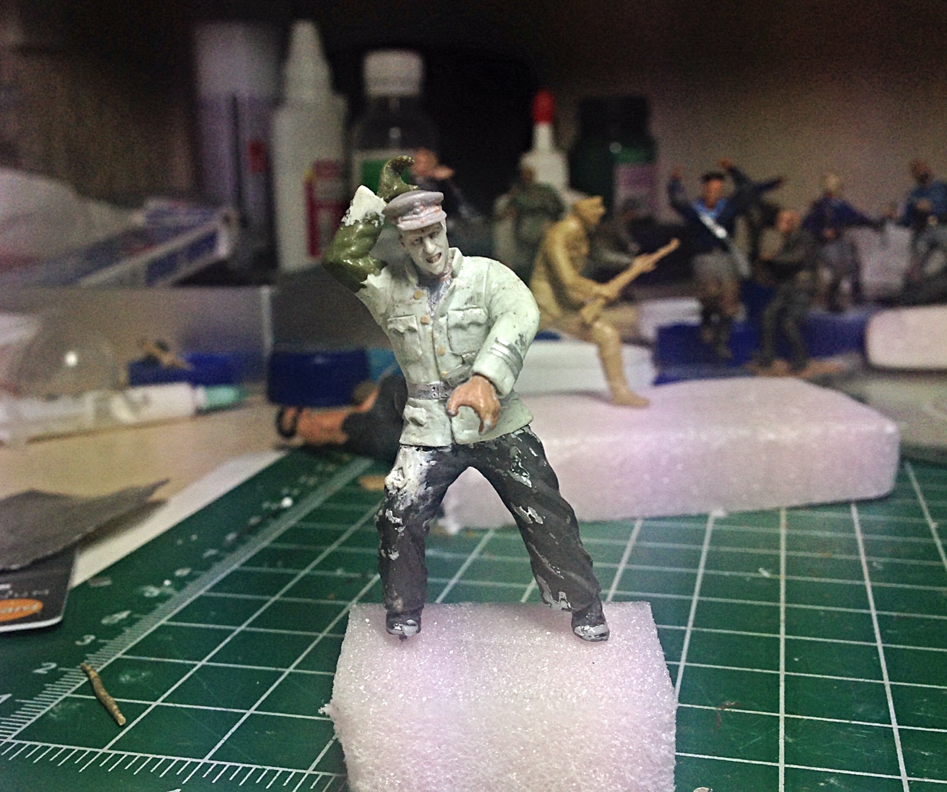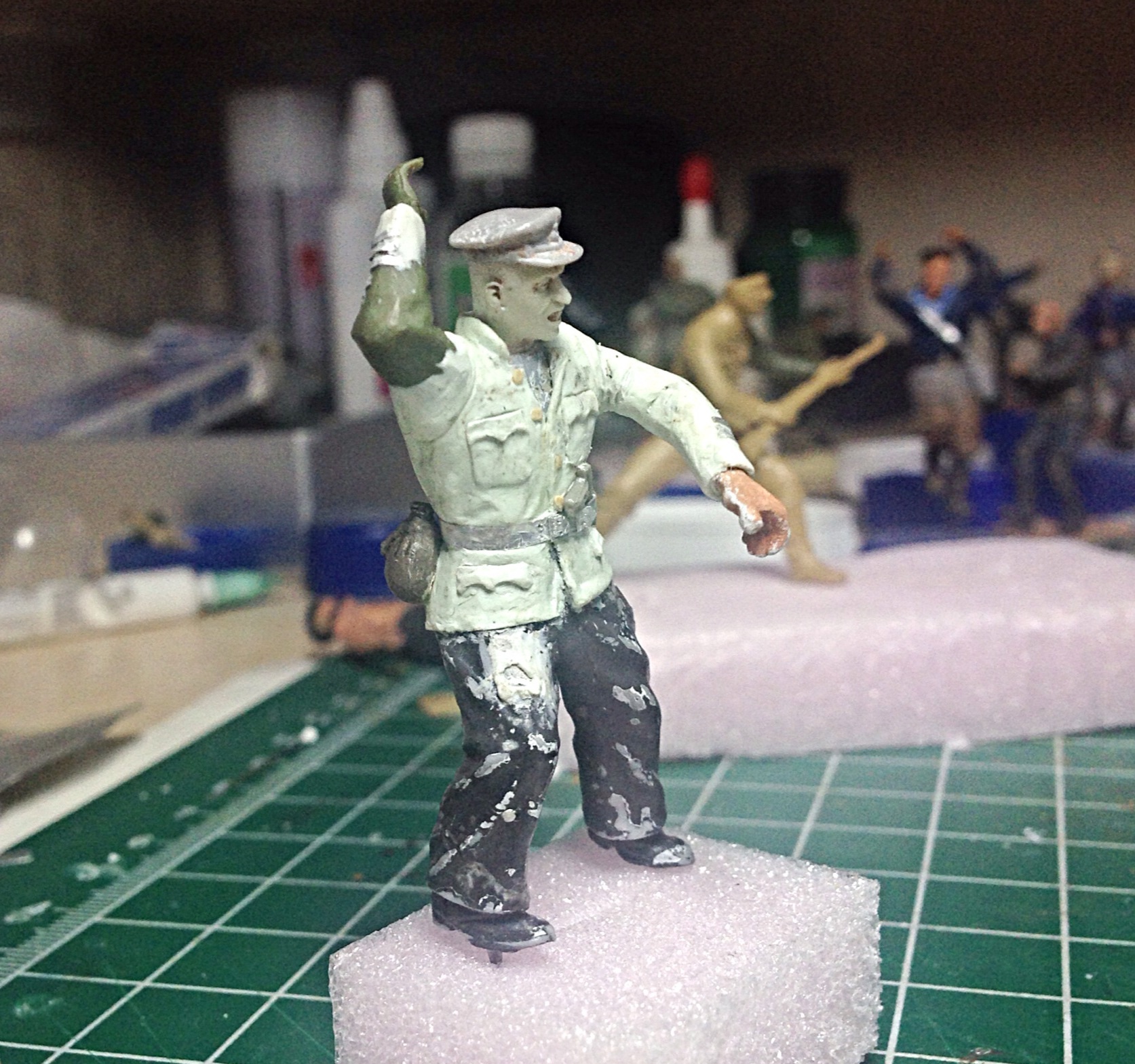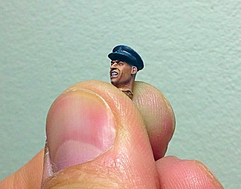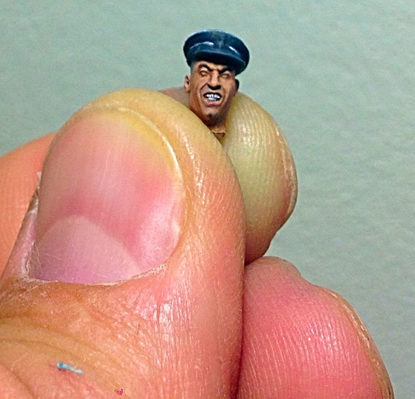Начал окрас головы у офицера. Пока нравится- оскал такой получается- боевой! Хочу сделать ему "под ноль" прическу. Жиденько развел черный, белый, синий- окрасил виски, затылок.. Вот над этим стоит поработать!