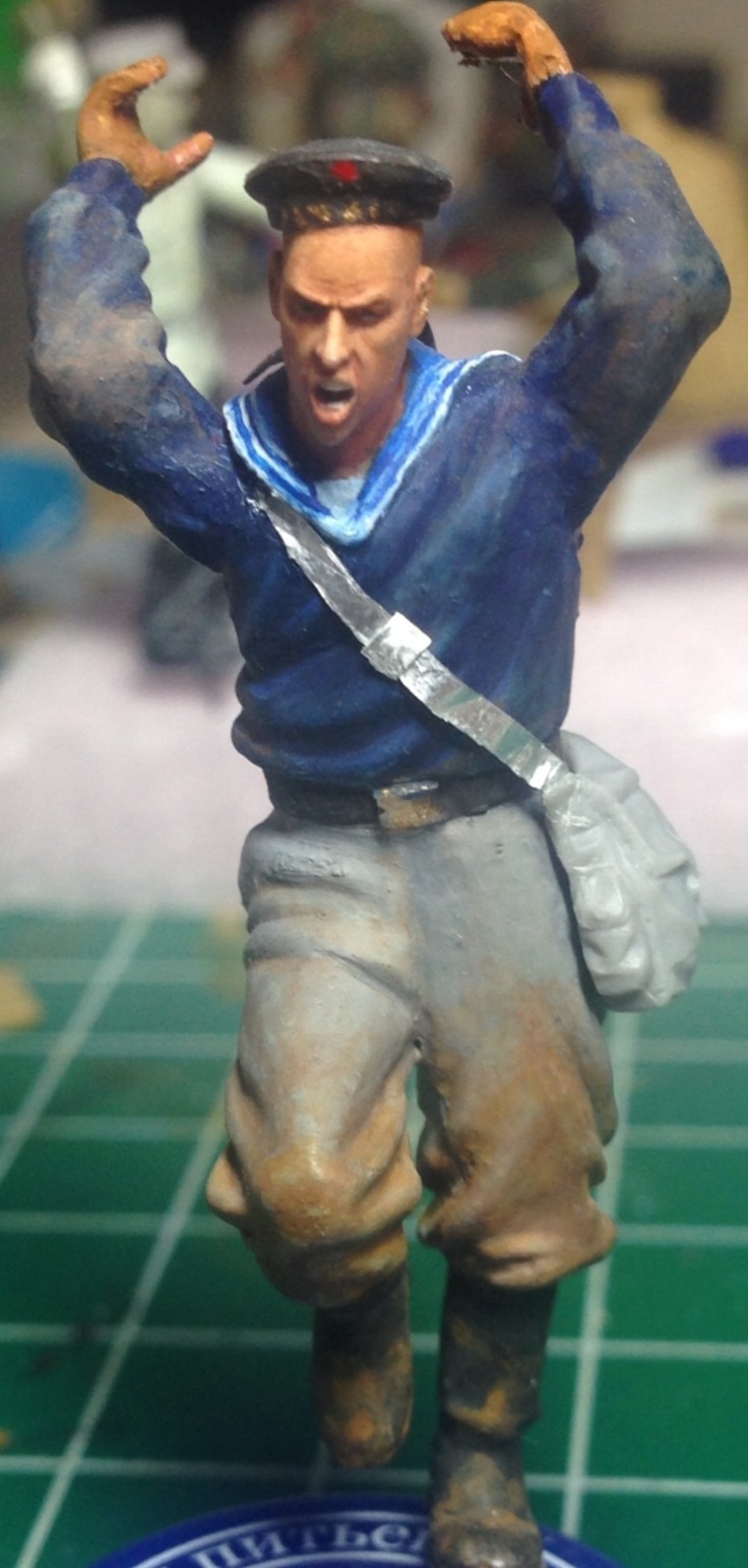 Немного о бойце. "Заготовка"- из набора морских пехотинцев "Звезды. Можно узнать по брюкам, позе. Правая рука из другого набора.. Даже и не скажу какого, скажем из запасов;) голова- Хорнет! Очень достойные дополнения к моделям!(не сочтите за рекламу). Этот моряк в звании главстаршины, будет одной рукой как бы перехватывать удар немецкого штыка, а правой- наносить удар сверху вниз! Правда я еще не придумал чем.. Может "вложу" ему в руку кусок трубы, или что нибудь потяжелее (схватка будет происходить в разрушенном доме).
