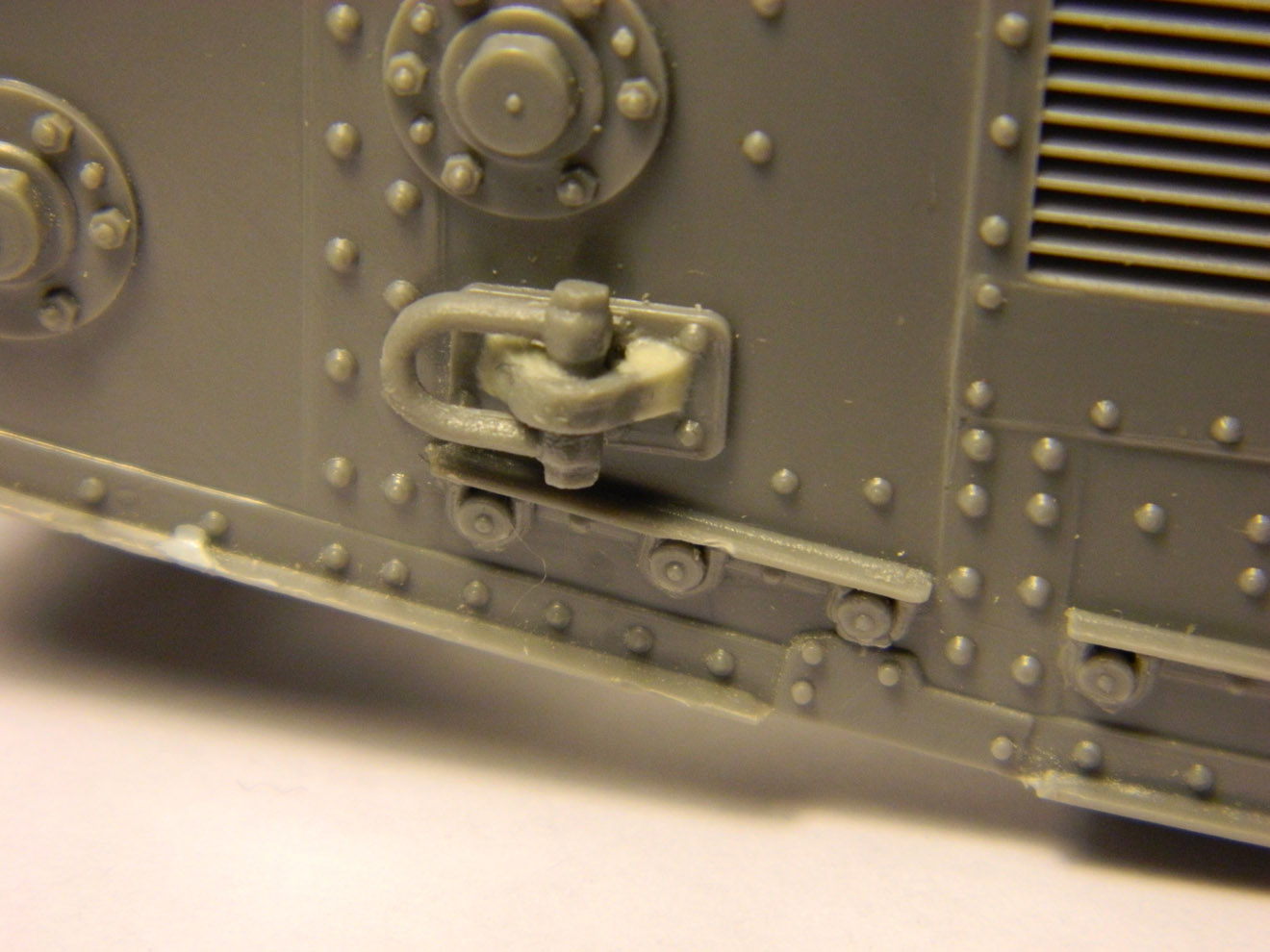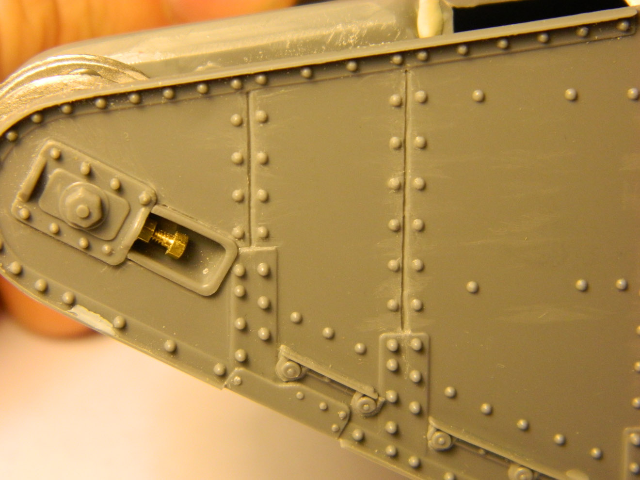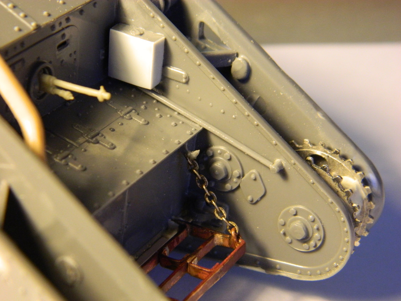 Что имеется уже на сегодня? В разгаре работа над танком Mark-V от фирмы Interus. Те, кто сталкивался, знают - модель не из простых, если делать по-хорошему. Практически всё, что выставляется над бронёй, пришлось переделывать, да и саму броню производитель сделал с косяком - расшивка бортов воспроизведена не в виде щелей, а рельефными валиками, напоминающими скорее сварные швы. Их пришлось соскоблить и прочертить щели. Глушитель имел мало общего с настоящим - изготовлен новый. Воздухозаборник рядом с ним тоже: его форму производитель просто напросто придумал. Кое-где добавлены недостающие, забытые производителем детали. Много работы потребовала корма танка - добавлены маслопроводы, ведущие к звёздочкам, изготовлена откидная решётка, которую производитель не воспроизвёл, но которая была практически на всех машинах.