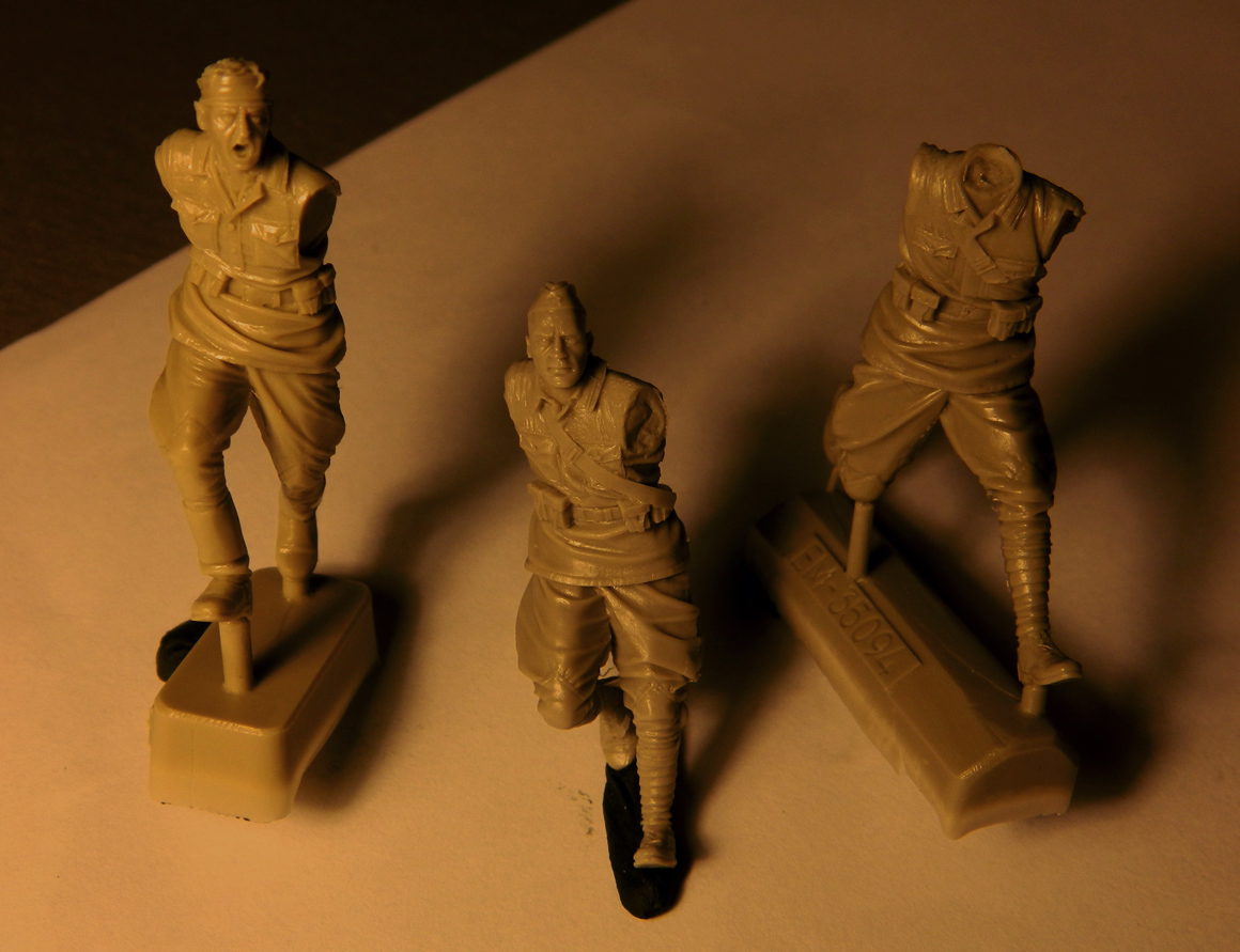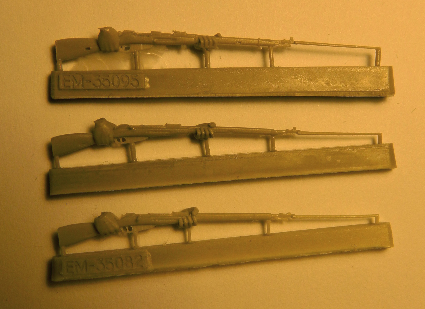 До этого я видел лишь собранные фигурки в качестве презентации. По распечатыванию упаковки возникли смешанные чувства. Литьё замечательное, в натуре фигурки смотрятся ещё изящнее, чем на фото. Но вот кое-чего я откровенно не ожидал в силу своей неопытности по части работы со смолой. Часть амуниции, которая у меня целиком подлежит замене оказалась отлита вместе с телами - ну это ерунда, не трудно справиться. Сложнее обстоит дело с винтовками, которые отлиты вместе с кистями рук, или наоборот:)