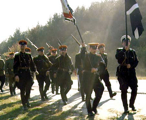 Почему мне и кажется, что солдаты-корниловцы, если будут одеты у Вас поголовно в чёрную форму и цветные фуражки, будут выглядеть скорее по-киношному, чем исторически. Или как на шоу реконструкторов.