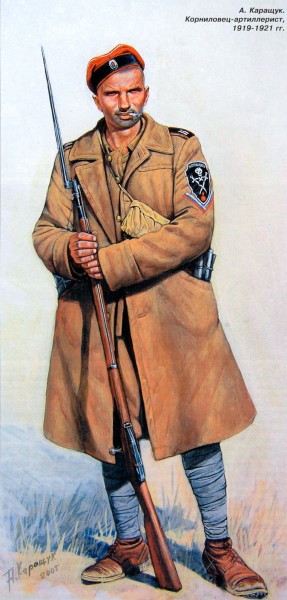 Тем более, что очень большая часть корниловцев к тому времени были вчерашними красноармейцами, взятыми в плен, и на быструю руку снова влитых в постоянно редеющие части. И которые были одеты всё в те же обноски старой формы, что и все остальные. А уж если кому доставалась английская - тот вообще считался счастливчиком.