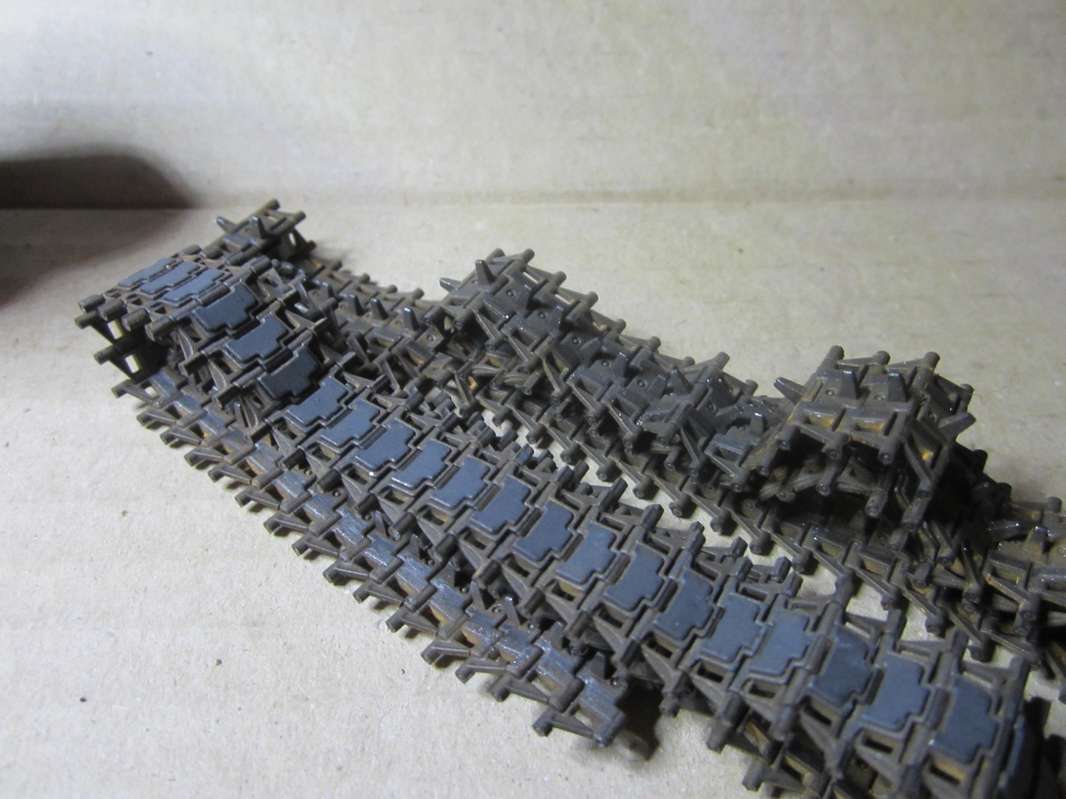 Пластик траков по ощущением тверже основного. Траки отлиты попарно, ничего лишнего, никаких заусенцев, собираются на клик, подвижные.