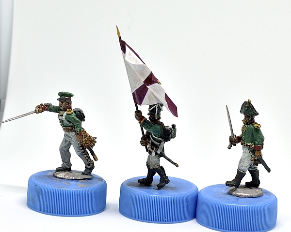 Вчера и сегодня красил пару офицеров. В шляпе - капитан от Варлорд, в фуражке - подпоручик от Перри. Знаменосец - состарено знамя, доделан золотой галун на воротник. Клинки заменены на выточеные из твердой стали при помощи проксона и алмазного диска. Еще будет матовый лак, пока что еще после масла блестит.