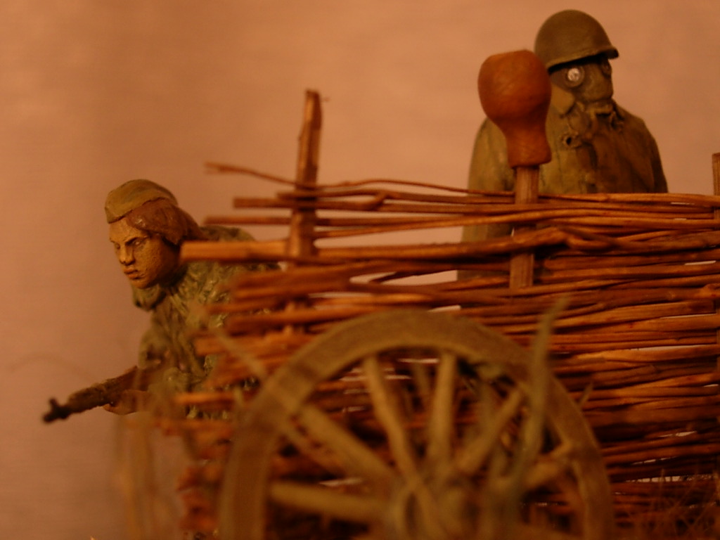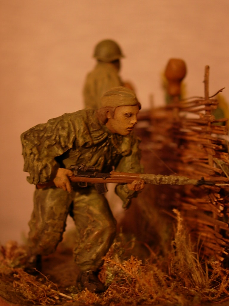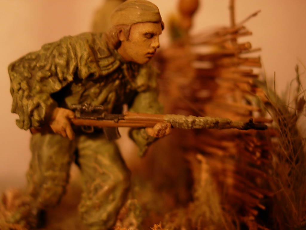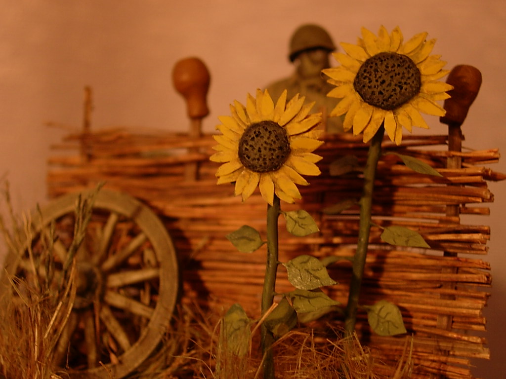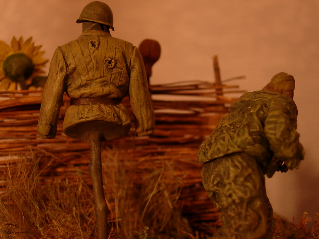 Хочу выставить на форум несколько фото виньетки ,, Вдвоем с братишкой,, Фигурка снайпера и ,,братишки,, – от ,,Звезды,, . Основание – гипс. Трава – пакля и сухоцвет. Плетень – веточки, надерганные из веника. Подсолнух – проволока, бумага. Окрашено все эмалями Хамброл. Сделана виньетка полгода назад. Но сфоткал ее недавно. Жду ваших отзывов!!!
