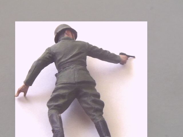 Вообще не очень аккуратно(особенно не понятна ситуация в районе рукоятки пистолета), на лице похоже что слой краски слишком толстый. Высветления драйбрашем?