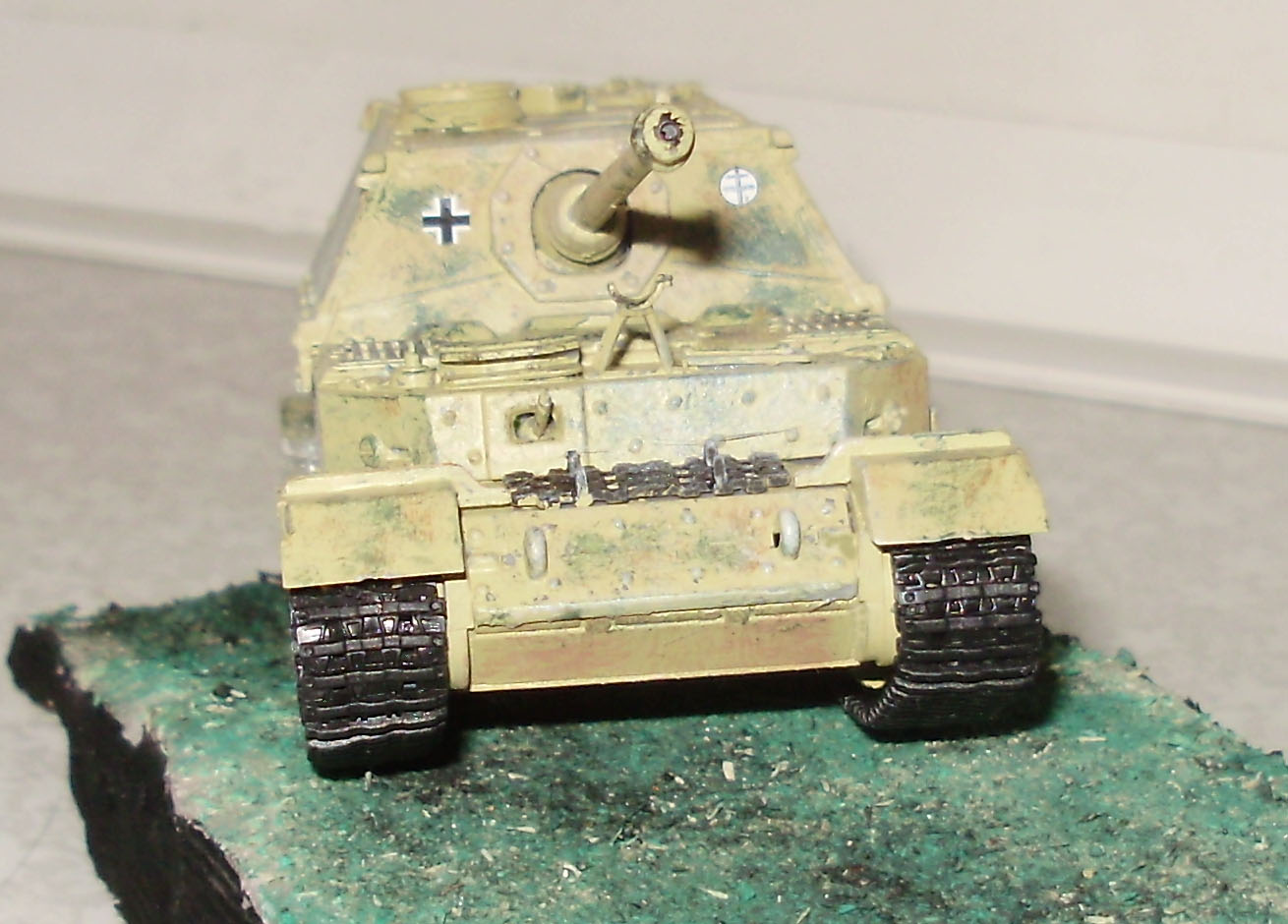 По окраске не совсем ясно что вы пытались показать зелеными потертостями поверх базового окраса. Это иммитация потертости краски или попытка сделать камуфляж? Ствол пулимета надо ганметаллом красить, а на гребни траков можно добавить немного серебрянки.