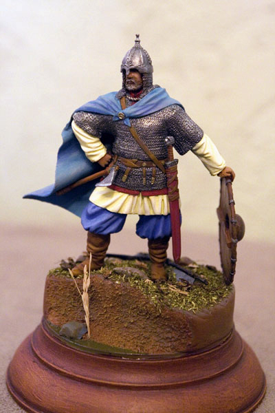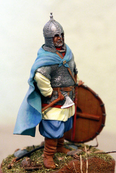 Древнерусские шлемы обычно украшались инкрустацией, золото в сочетании с серебром. На фигурке эти детали имеются, выделения цветом не вижу. Впрочем, еще вроде не поздно исправить. Ну и замечание к скульптору - топор уж больно фэнтэзийный, поменьше они были, посмотрите работу А.Н.Кирпичникова.