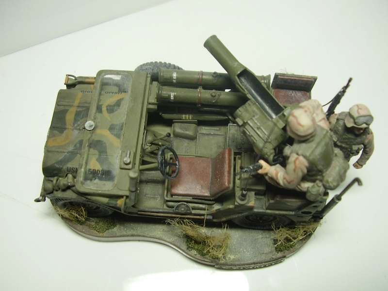 Аккуратненько, но "изкоробочно". Несколько соображений по возможной доработке. Отверстия облегчения на дисках колес стоило бы засверлить поглубже. Такой камуфляж, как на солдатах, появился в войсках (в том числе в USMC) в начале 90-х, когда все М825, ИМХО, из штатов частей морпехов вывели. Шнур трубки радиостанции у амеров витой.