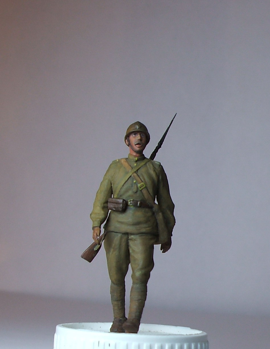 А какую винтовку вы ему дали? Если из набора советской пехоты от Звезды, то ее надо переделать из модификации 1930г. в модификацию 1910г. Также, по-моему, бриджи не были характерны для пехоты РИА (знатоки РИА поправьте, если ошибся), шаровары солдат не имели сужений к коленям. И еще, ИМХО, надо было переместить планку гимнастерки с центра на правый или левый бок. Такие гимнастерки, естественно, тоже были и ошибки никакой тут нет, но это выглядело бы более оригинально и еще больше отделяло бы результат конверсии от исходного материала.