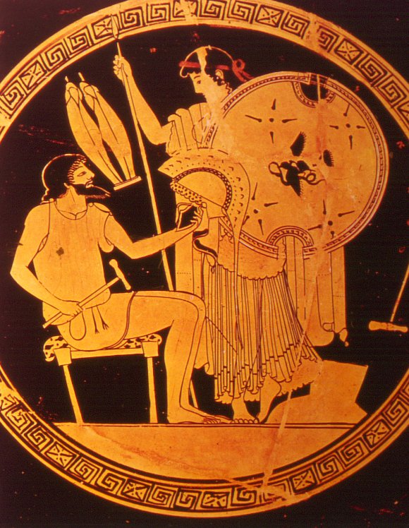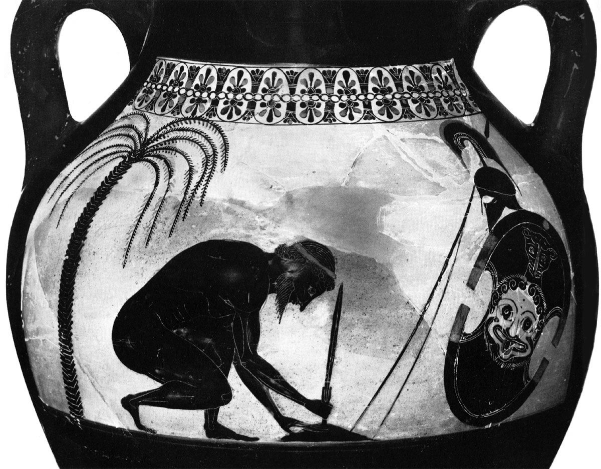 Пожалуй, это всё же не дипилонский щит, а беотийский, учитывая его конструкцию. А щит с порпаксом удобнее будет нести так, что выемки окажутся сверху и снизу. Конечно, если допускать возможность существования такого щита в принципе