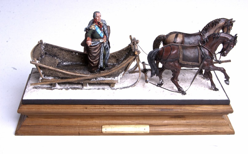 про сдерживающего лошадей думали(с братом делали)только заранее купленная подставка не позволила разместить еще персонажа.постромки сдумали ослабить опять же из-за ограниченного пространства рассчитывая на то что кони двинут и натянут.безопасность фельдмаршала точно под угрозой я бы так стоять в санях не стал.работа первая и не скрою,спешная.