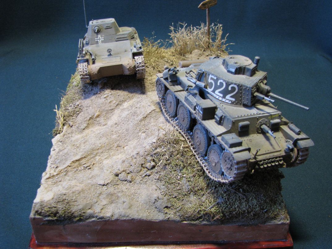 Максим Пешков, очень и очень здорово для первой работы. Искренне поздравляю. Небольшая критика, так сказать, ИМХО. Во-первых, всё же не хватает фигурок, это бы оживило диораму. Во-вторых, летом 41-го для немцев было важно хапнуть земли, поэтому танки, там где это было возможно, ехали по дорогам. Ну и в-третьих, номера наносились в панцерваффе по чётким регламентам, а не от руки.