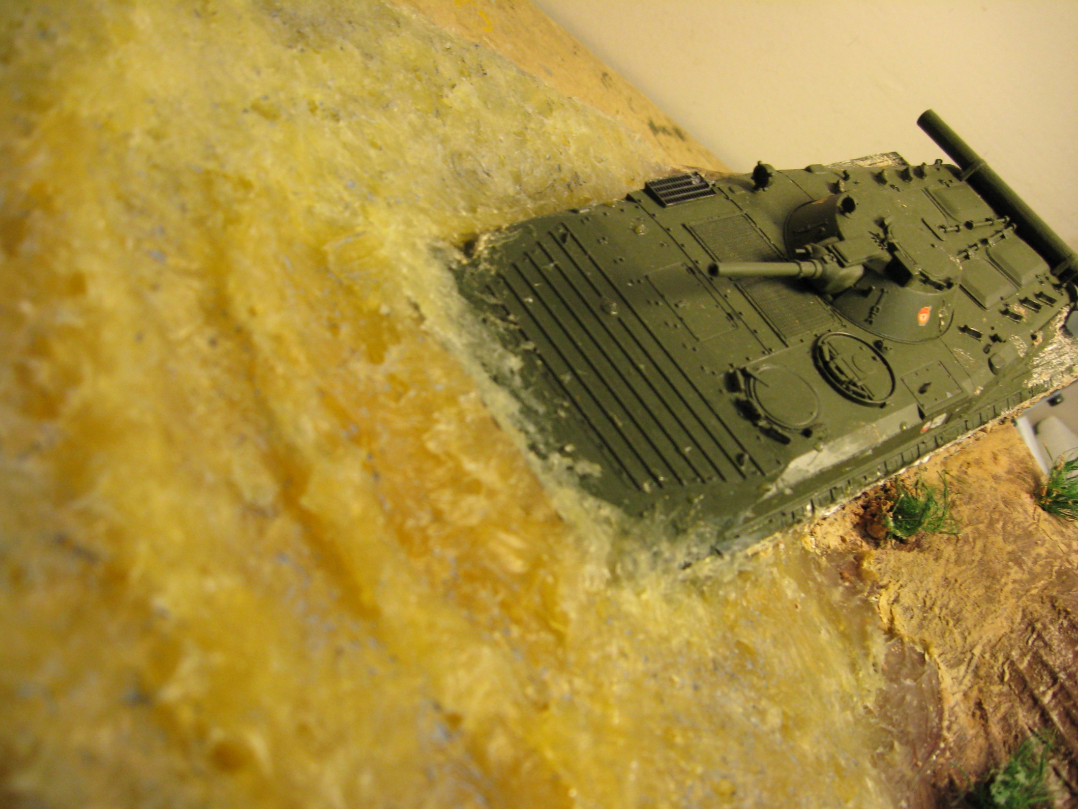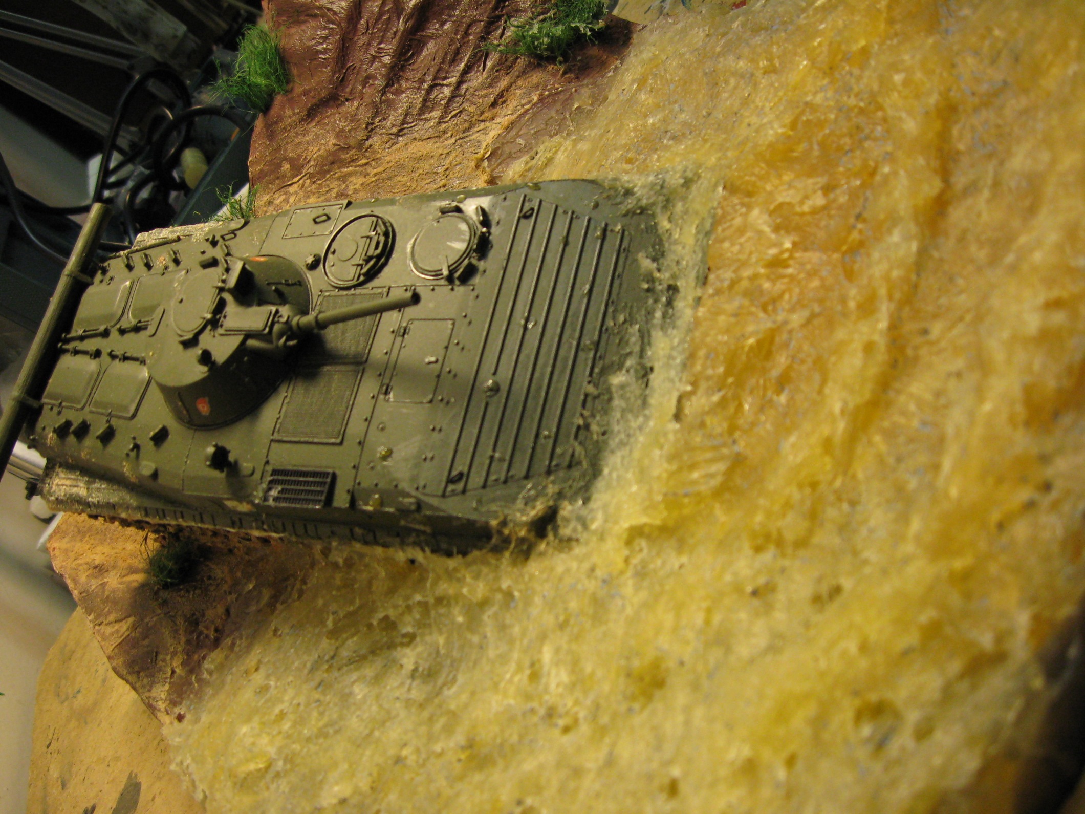 Прости те конечно меня великодушно, но , вы конечно можете не поверить, я брал эту диораму с фотографии. БМП входит в какую-то мутную реку (наверно глинистыю) , разбрызгивая грязь и воду.