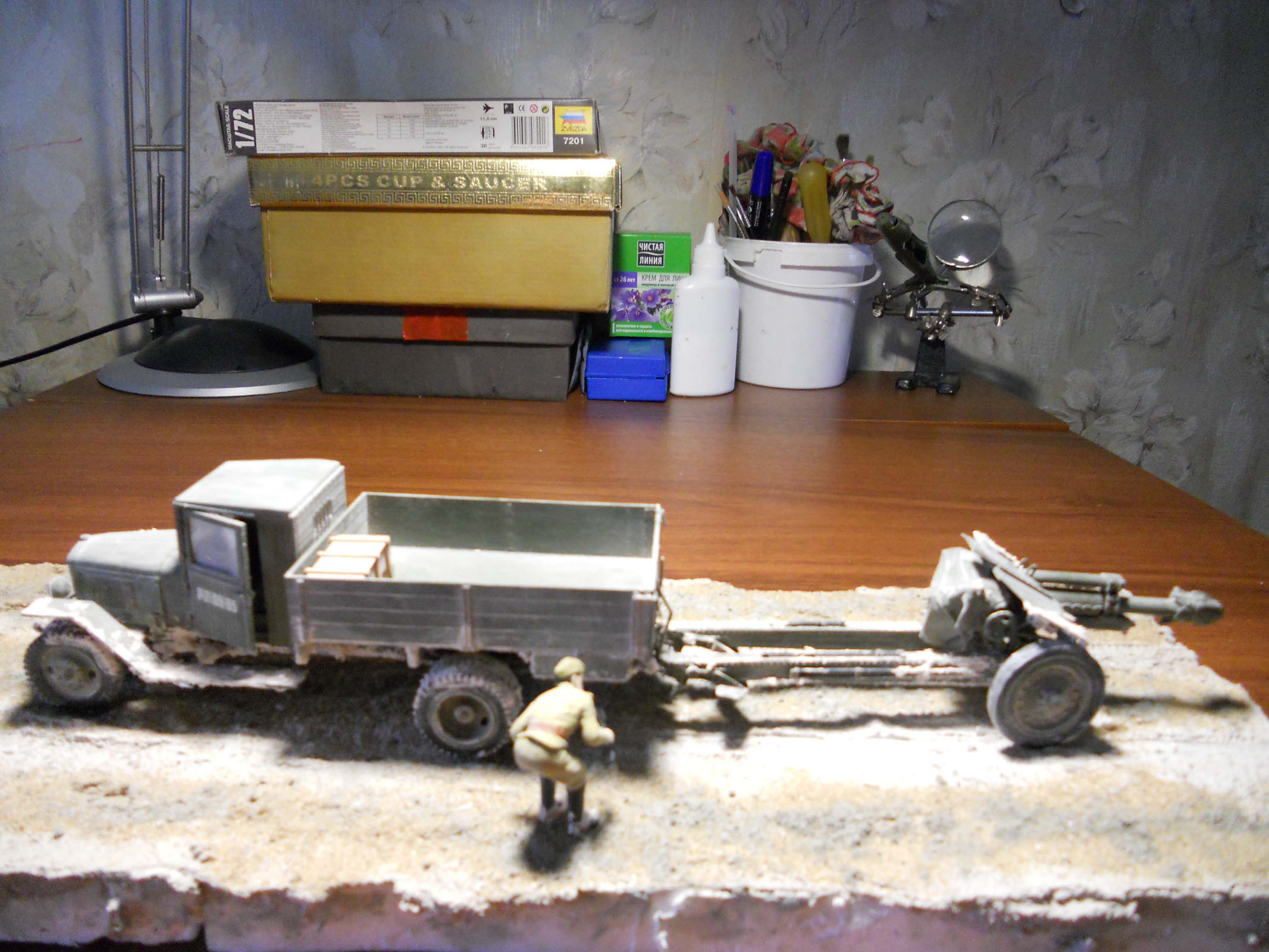 Маштаб модель 1:35 "ЗиС-5В" и "Гаубица 122мм М-30", модели фирмы "Звезда", красил акриловой краской фиры "Звезда". Использован материал для основания песок, цемент, шпаклевку.