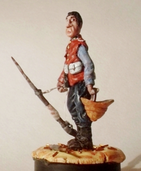 Выполнено из двукомпонентного пластичного эпоксилина дуо «Момент», окрашено акрилом REEVES. Подставка – крышка от питьевого йогурта и масса для лепки КЕРА. Ассегай – палочка от мороженного и эпоксилин. Гильзы – медная проволока. Размер 80мм.