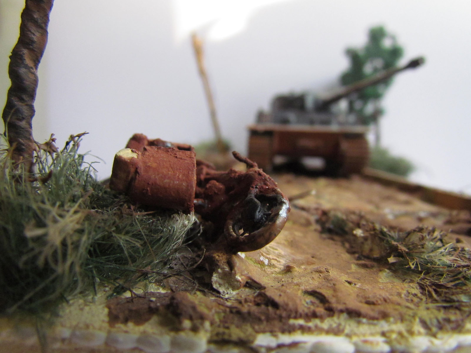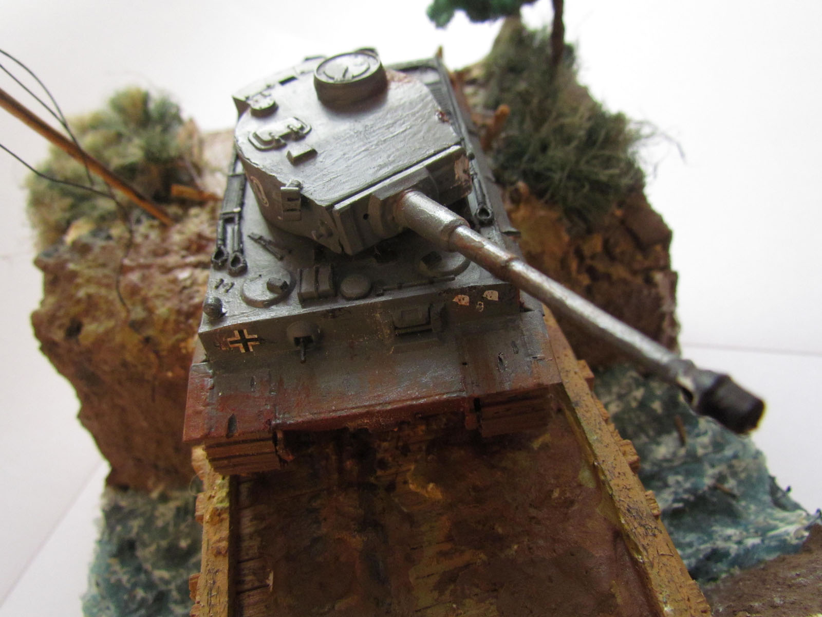 "Тигр" фирмы "Моделист". Окрашивал краской "Супер" от "Звезды". Основа лист фанеры (берега-пенопнаст), покрытие Сухой ровнитель для стен(спасибо ремонту=D)+песок. Мост из резаных и двух целых "штапиков". Много раз переделывал воду , но вроде что-то вышло=).деревья делал из прволки и молотой губки. Трава из сан.тех. льна. Мотоцикл из проволки, эпоксилина, коляска из бумаги, колеса из стопорных шайб)).Сначала хотел мотоцикл пустить перед танком, но не хватило навыка сделать водителя (да еще в таком меленьком масштабе), не проподать же добру - состарил, сломал и внес в диораму)) Это моя первая работа- все замечания и советы приветствуются))) Надеюсь улучшить качество в следуюших работах. Спасибо.