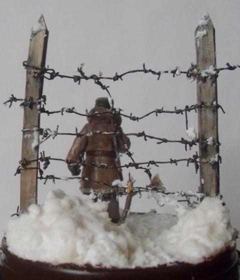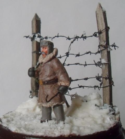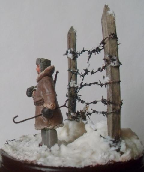 За колючкой -40, какой-то отмороженый урка рванул в бега. Старый конвоир спокоен: далеко не уйдет, не поймают - так замерзнет. В руке держит крюк, с помощью которого цепляли застреленного зэка за одежду и тащили в лагерь. Фигурка из эпоксилина, окрашено акрилом. Делал в 35м масштабе, но какой-то промах был допущен: высота в валенках и ушанке 55мм, но лицо в сравнении с фигурками от "Звезды" больно крупным вышло, карабин как-то не по размеру... Основание: крышка от мармелада, масса для лепки (смесь КЕРА и JOVI). Снег-смесь белого силиконового герметика с ПВА и содой. Хотел отправить в Галерею, но смотрю и понимаю: накосячил, а где - не пойму. :x