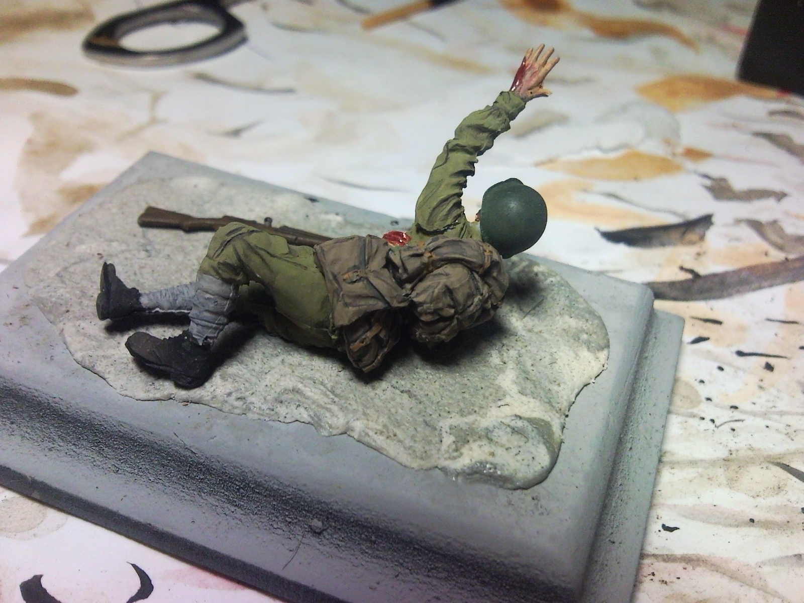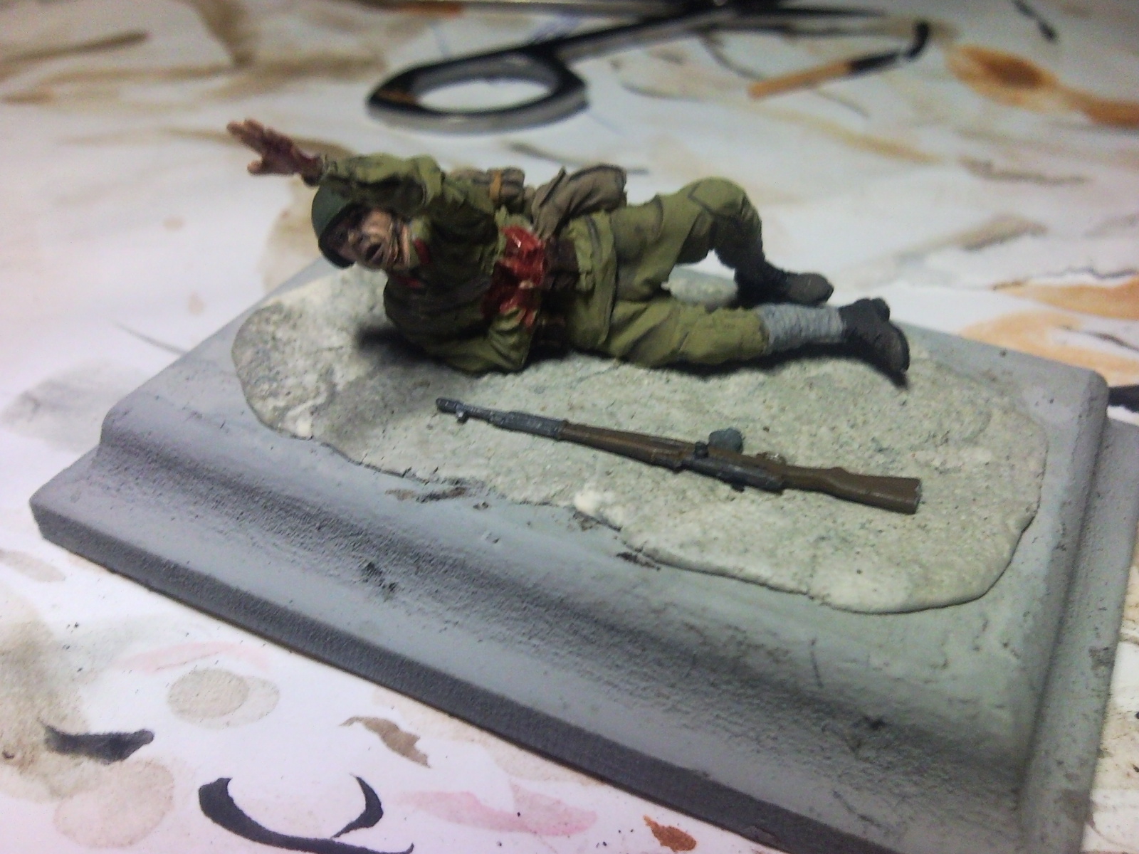 евгений965, неплохо, но есть ощущение. что перед покраской недостаточно "зачистили" фигурку.Снаряжение слишком однотонно: ранец, шинель, сумки - всё одного цвета. И не совсем понятно на чём лежит раненый. Но общее направление очень понравилось: присоединюсь к Семену ванову!