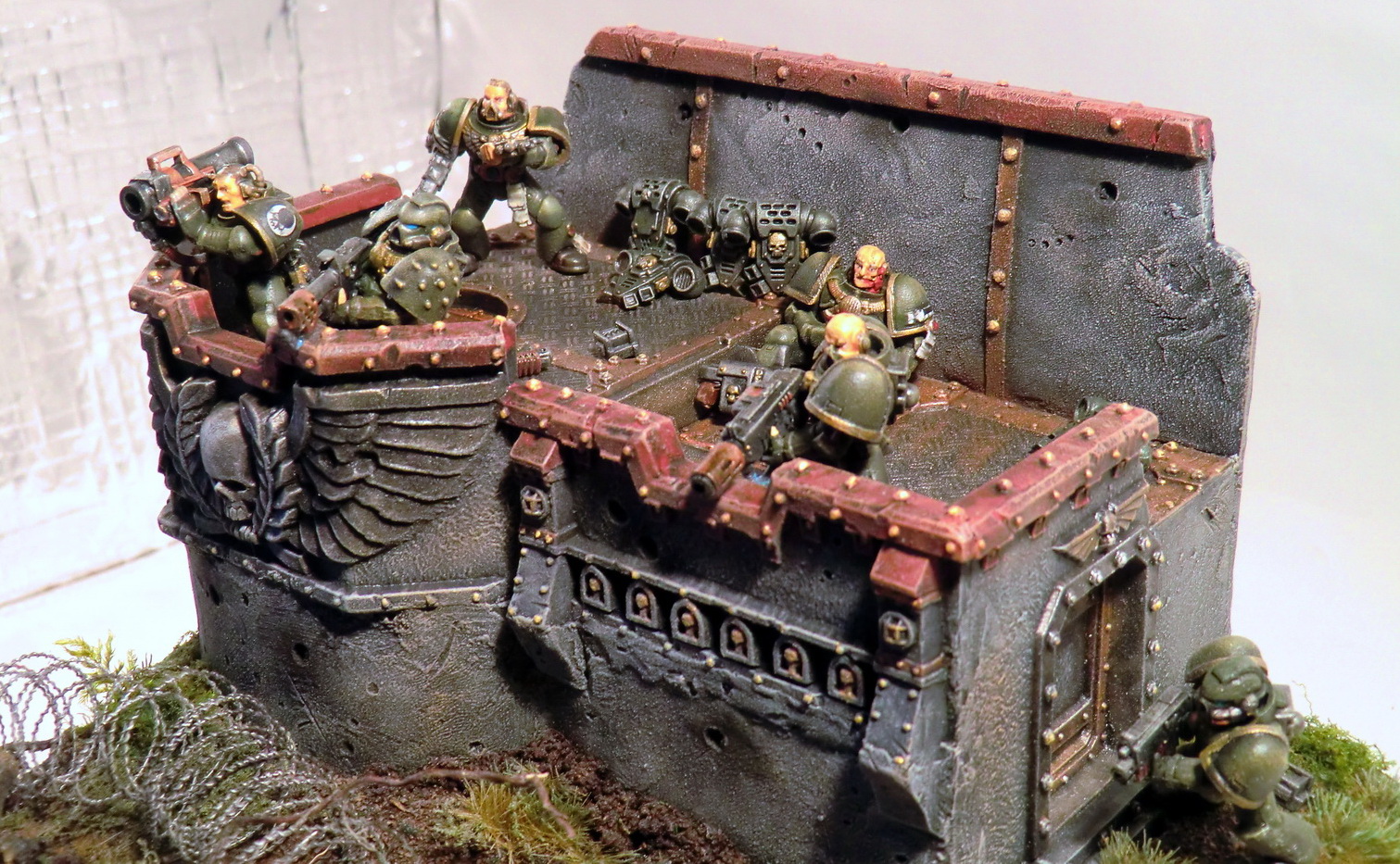Т.к. миниатюры не варгеймовские, то решил отойти от канонов Warhammer и сделал орков не зелеными, каковыми им положено быть, а более "людского" цвета. Space Marines тоже раскрашены без определенной привязки к кодексам и подразделениям. В общем - "свободное плавание".