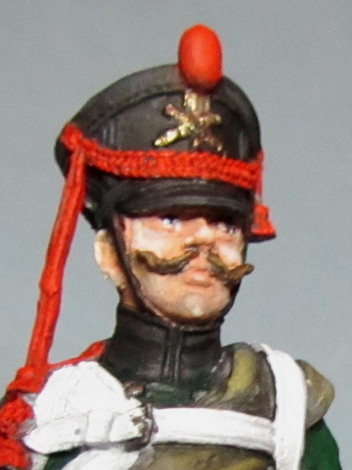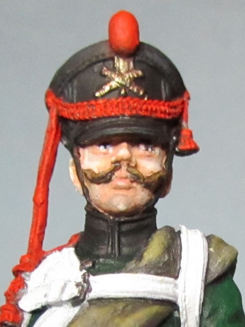 Раз выпушку н вороте исправили о ее пропускаем, но кожаная петлица на кивере должна быть черного цвета. Клапаны рукавов должны быть зелеными и выпушка вокруг них неверно показана. Ну и пуговицы на крагах надо окрасить :)