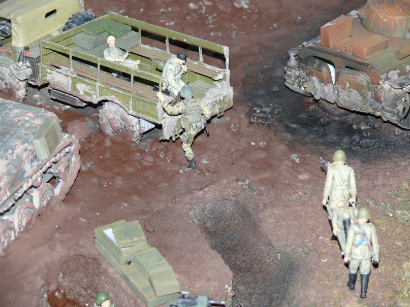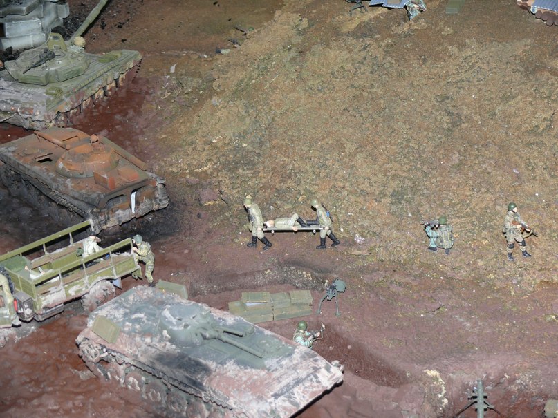 Как я говорил уже ранее мне был задан определённый сюжет (см. выше), времени на изготовление фигурок которые переносят ранненого не было, и именно по этой причине я включил сюда бойцов ВОВ не много их подпилив. Эта диорама находится в нашем ОМОНе в музее и до этой темы вопросов ни у кого не возникало (а там работают люди у которых не одна командировка в СКВО). Вы увидели что бойцы ВОВ по внешнему виду, или же имели дело с набором "Звезды" Санитары?