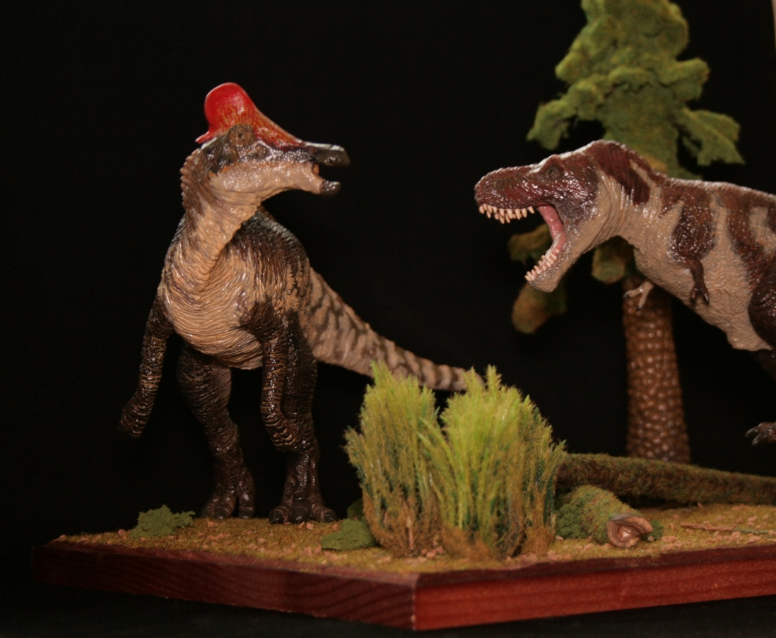 Касательно тираннозавра-его нет ни на первой,ни на второй диорамах.Это близкородственные животные Ти-рексу,входящие с ним в одно семейство.На первой диораме представлен Tarbosaurus efremovi ( голотип ПИН № 551-2) с промерами пропорций из обзорной работы Малеева(1955).Второй Albertosaurus periculosus-сейчас не валидный тираннозаврид из Приамурья описанный по крайнефрагментарному материалу Рябининым в 1932 году.Тут я несколько дал волю фантазии взяв за основу скелетную прорисовку Г.Пола.