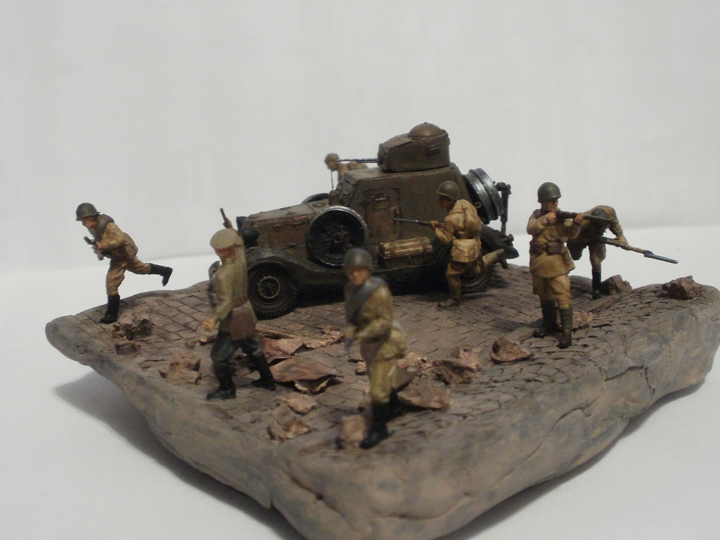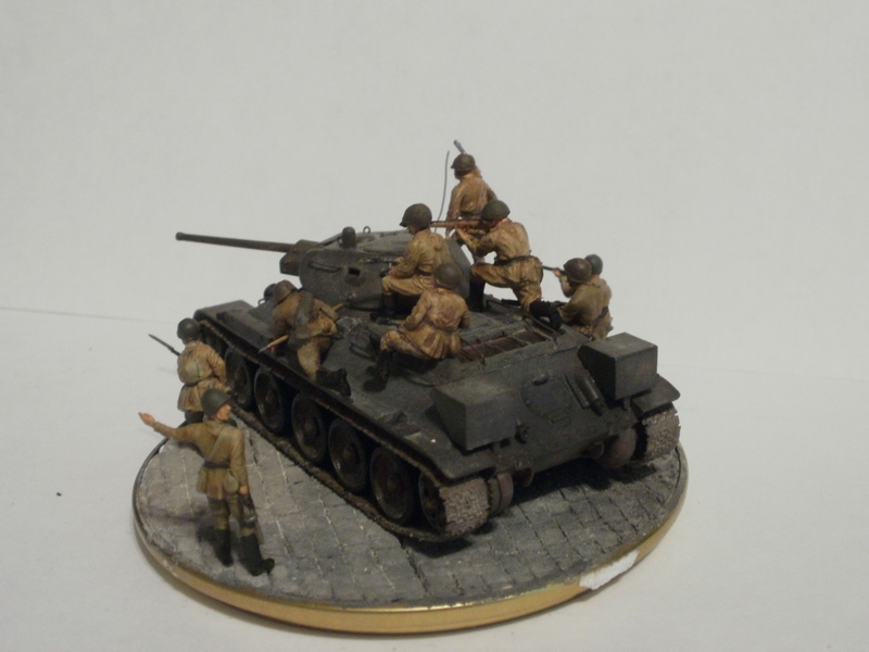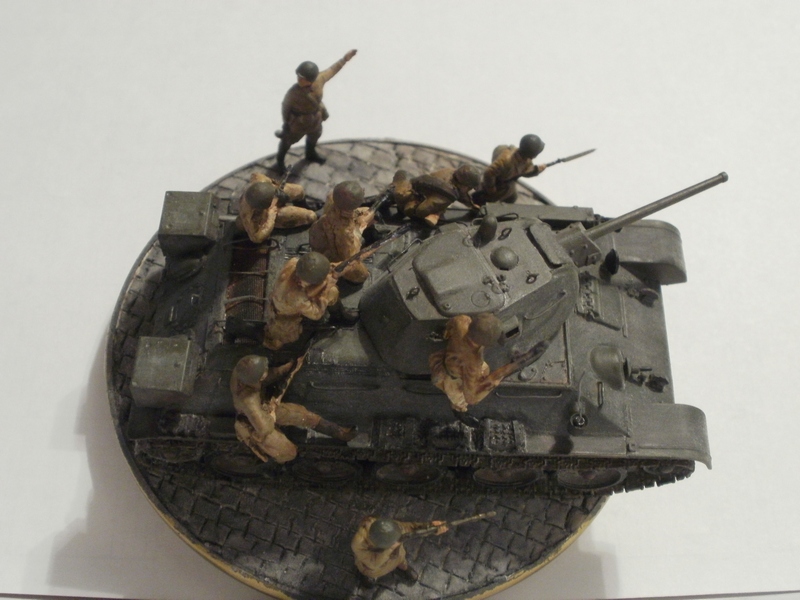 Если судить по позе бойца стоящего справа от танка и по командиру, то машина стоит. Тогда получается что десант готовится покинуть машину и командир должен стоять лицом к ним, указывая куда бежать. А тогда боец бегущий в штыковую либо лишний, либо должен находится позади всех. А то что происходит за пределами виньетки мы, зрители, не видим и Вашего замысла не знаем, поэтому фигуры должны взаимодействовать только между собой. Вот как на Вашей работе с СУ-85: ясно, понятно, никаких вопросов ( разве что к качеству фоток). И здесь: если бы не эти двое слева - была бы первоклассная виньетка. Вообще привлекла, я бы сказал - очаровала, именно компактность виньетки; у самого есть тридцатьчетвёрка, задумался над чем-нибудь подобным.