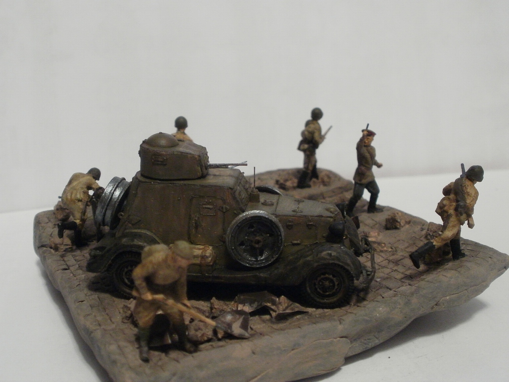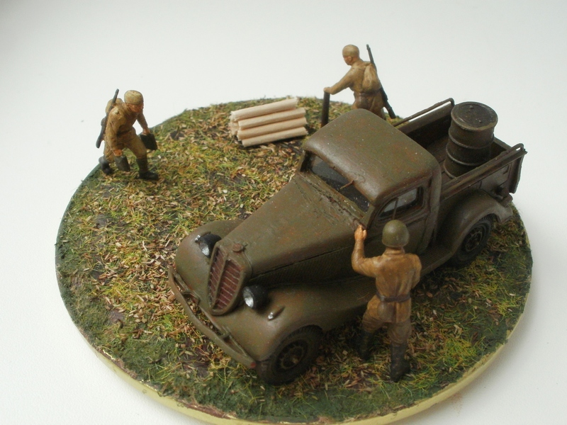 использовались наборы "Звезда" и UM, крышка от банки, шпатлевка, неудачная попытка изобразить разбросанное сено-конский волос, краски "звезда"