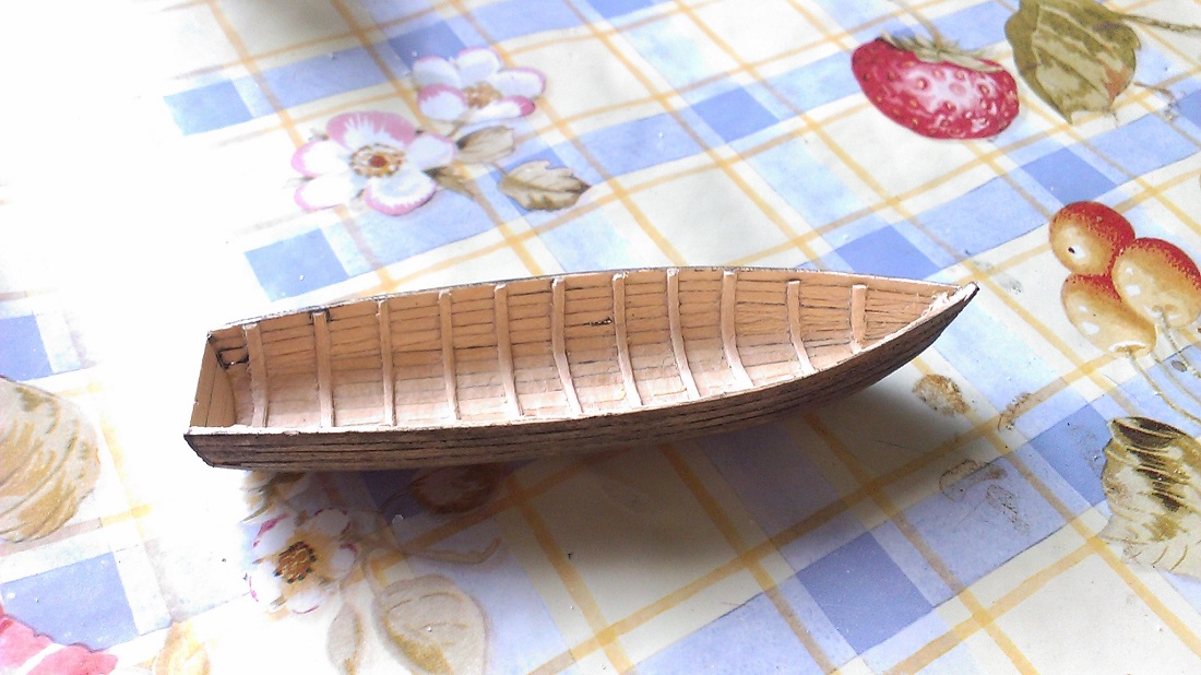 Всем доброго времени суток!Как-то пришла в голову мысль построить диораму на мирную тему, дом на берегу озера. Своего рода мечта, где бы я хотел встретить старость. Однажды, не помню где, видел обзор постройки лодки и решил попробовать сделать лодку для диорамы в 35 масштабе. Из материалов использовались деревянные рейки и клей ПВА. Из березы вырезал болванку по форме лодки, на досточке сделал отверстия для силовой конструкции лодки (не знаю как по морскому это называется), затем тонкие рейки распаривал в горячей воде и устанавливал поверх болванки в отверстия, после высыхания начал ряд за рядом наклеивать рейки корпуса лодки. В общем получилась работа выходного дня без напрягов и нервов на минутном порыве. От вас жду критики, может где-то чего-то не правильно сделал, т.к. человек сухопутный.