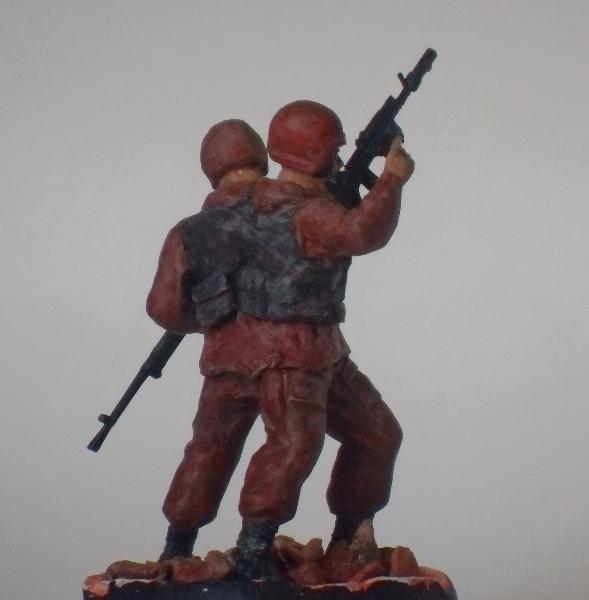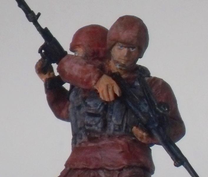 Идея переделать валяющихся без дела бойцов спецназа от Звезды в сиамских близнецов принадлежит моей дочери Алёне. Композиция также её идея. Автомат переделал в "булл-папп", в руках у левого коллайдер на базе горюновского пулемёта. Блеск форме придаёт то, что сделана она из кожи марсианского сузула