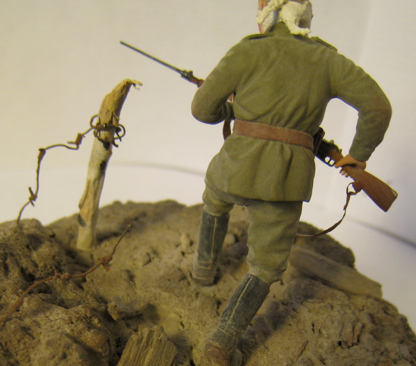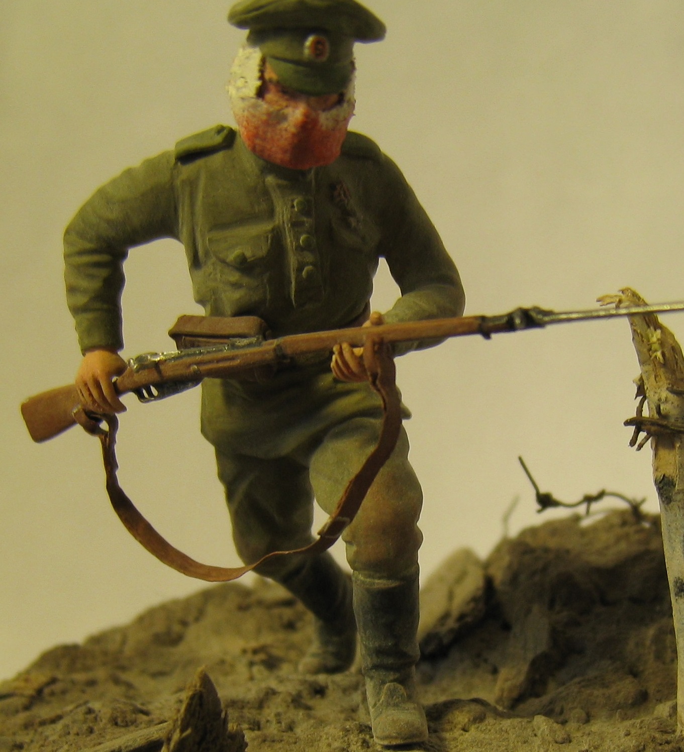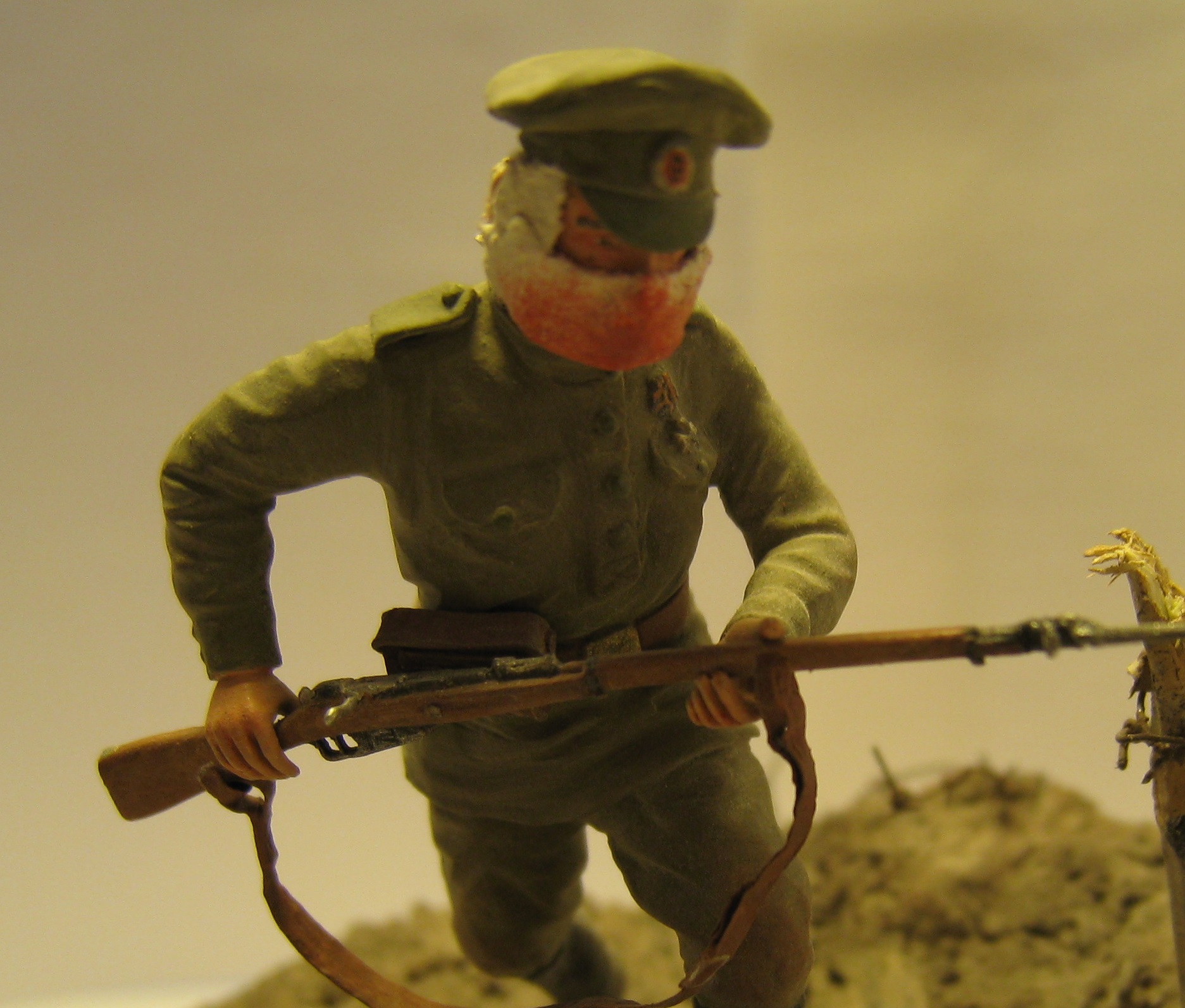 Добрый день! Представляю вашему вниманию работу на тему "Атака мертвецов".Очень давно хотел сделать эту виньетку ,перерыл всё что мог , но к сожалению информации крайне мало. Даже не думал , что закончу её как раз к столетию этого события. Солдат фирмы Мастерклуб(точнее его конверсия) - руки взял из набора русской пехоты фирмы ICM и добавил марлевую повязку. Краски: АКАН, Тамия, акрил от Звезды. Основание - алебастр,шпатлёвка по дереву, всякие камешки и песок со двора, даже поперчил и посолил(в прямом смысле).