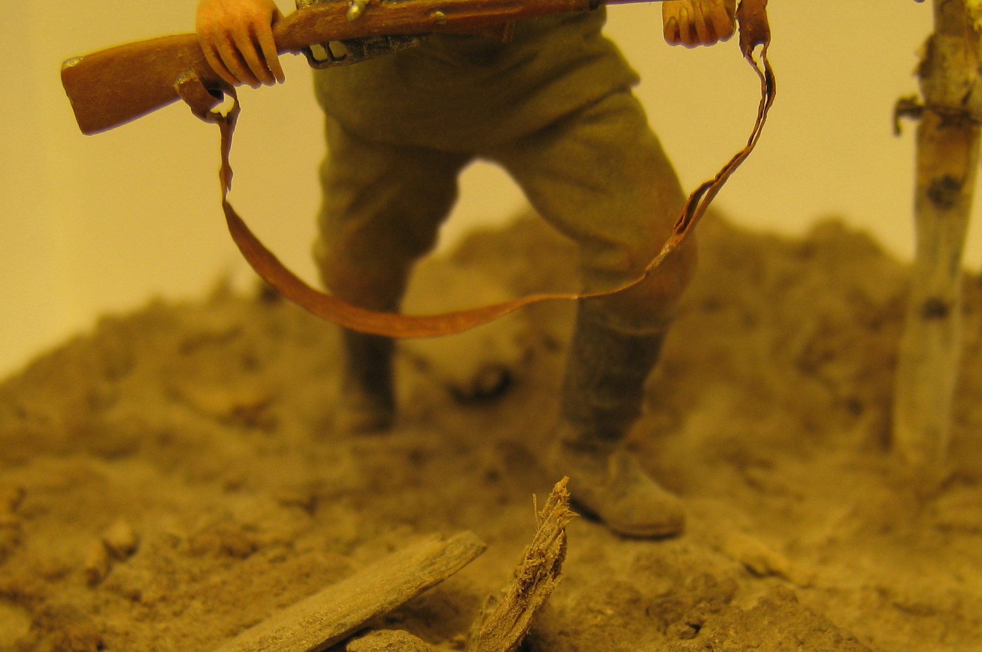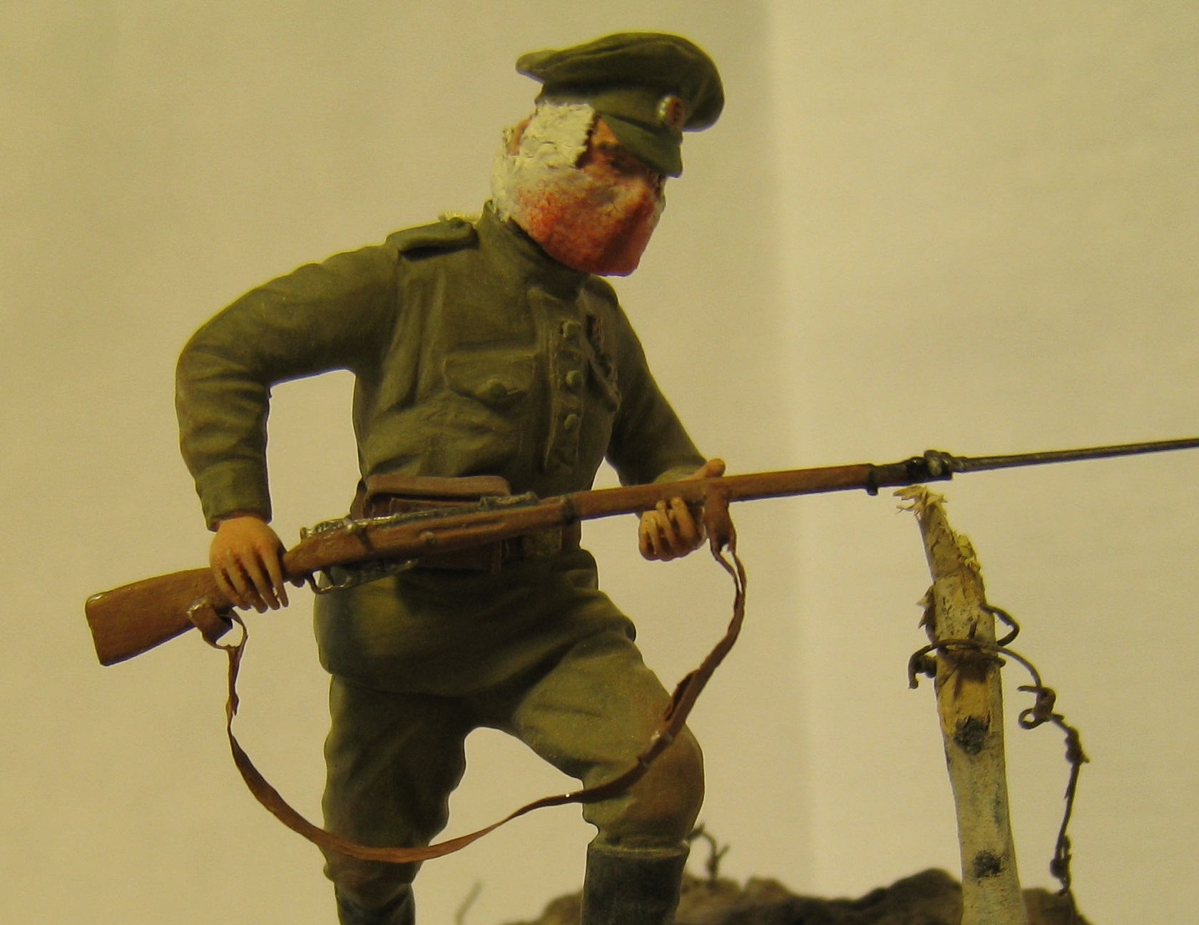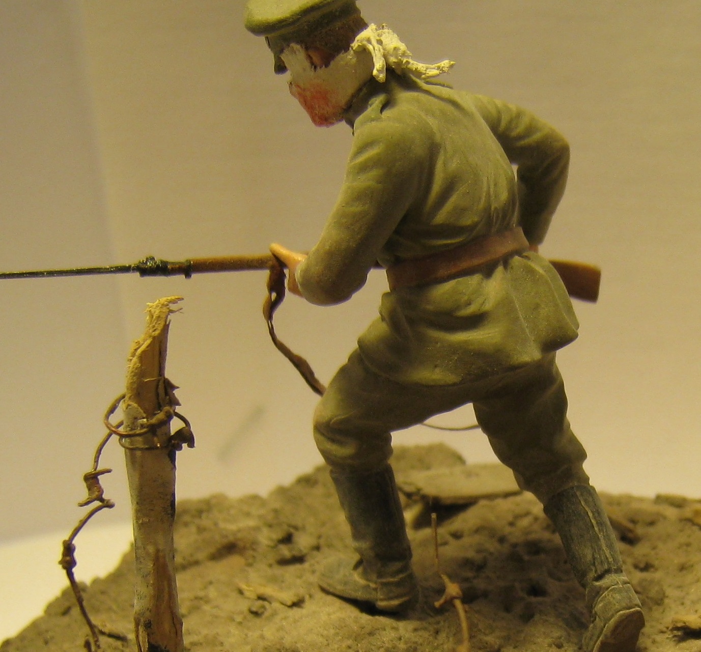 Добрый день! Представляю вашему вниманию работу на тему "Атака мертвецов".Очень давно хотел сделать эту виньетку ,перерыл всё что мог , но к сожалению информации крайне мало. Даже не думал , что закончу её как раз к столетию этого события. Солдат фирмы Мастерклуб(точнее его конверсия) - руки взял из набора русской пехоты фирмы ICM и добавил марлевую повязку. Краски: АКАН, Тамия, акрил от Звезды. Основание - алебастр,шпатлёвка по дереву, всякие камешки и песок со двора, даже поперчил и посолил(в прямом смысле).